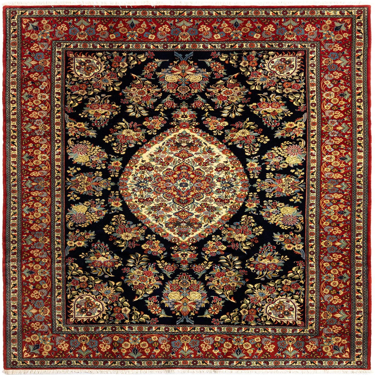 A classic Persian-style medallion rug with a rich dark blue field and an ivory central medallion, this hand-knotted wool piece displays an array of finely rendered floral sprays and scrolling vines. The deep red outer border frames the composition, while accents of warm gold, soft sky blue, muted green and rust add layered depth to the pattern. The knotting yields tight, detailed motifs and a smooth, slightly lustrous pile that feels soft underfoot and holds crisp definition in the intricate design.