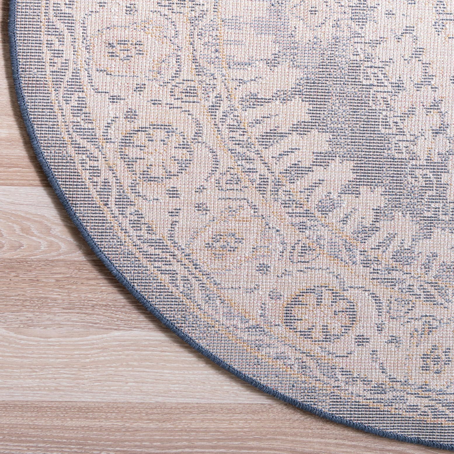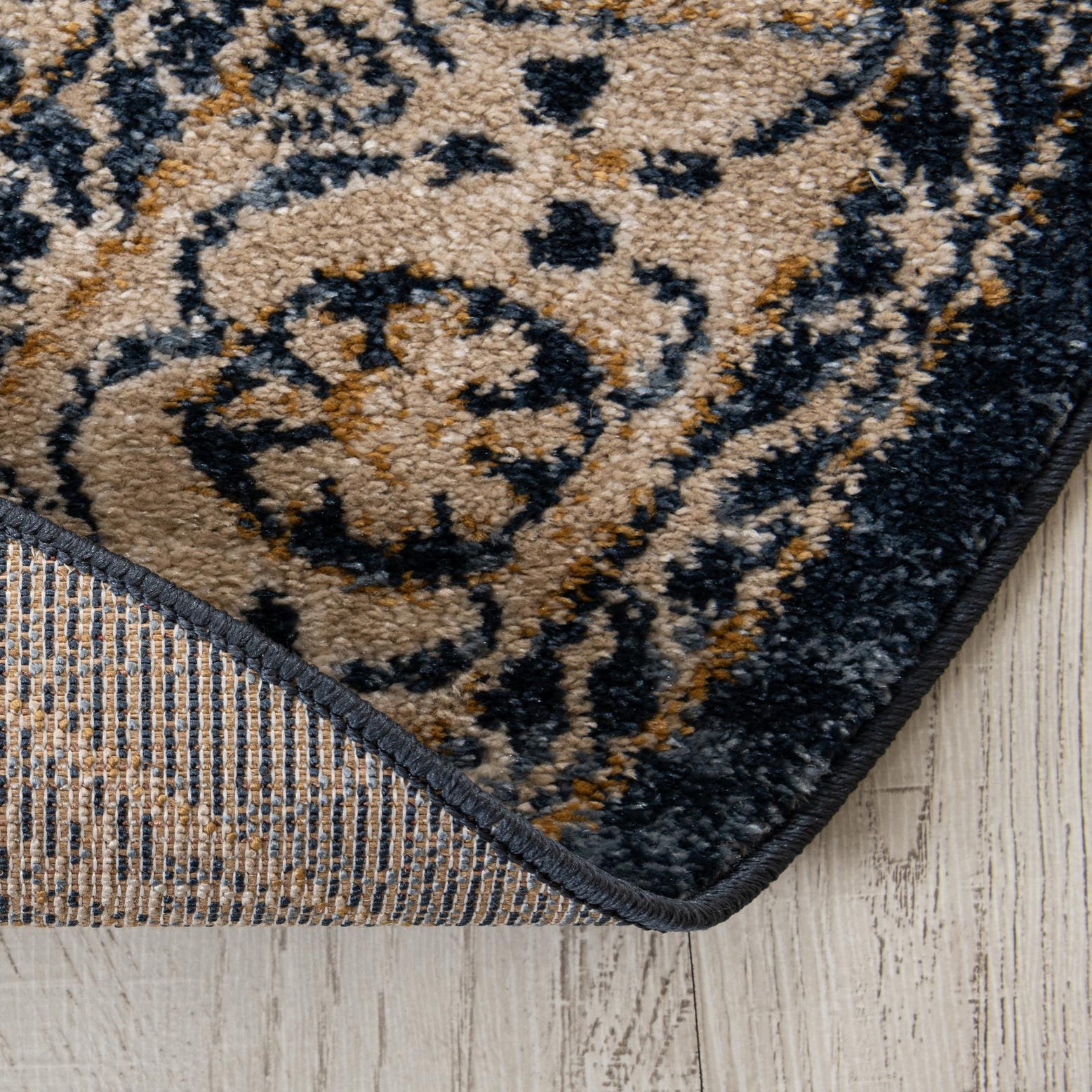 A classic medallion pattern rests on a deep dark blue ground, with an ivory-centered hexagonal motif and geometric accents in tan, light blue, and gold that create layered visual depth. A decorative outer border of linked rosettes and scrolling details frames the center, lending a traditional, slightly vintage-inspired character. Machine made from 100% polypropylene, the rug has a low, dense pile with a soft, velvety hand and a subtle luster that catches light without overwhelming the room.