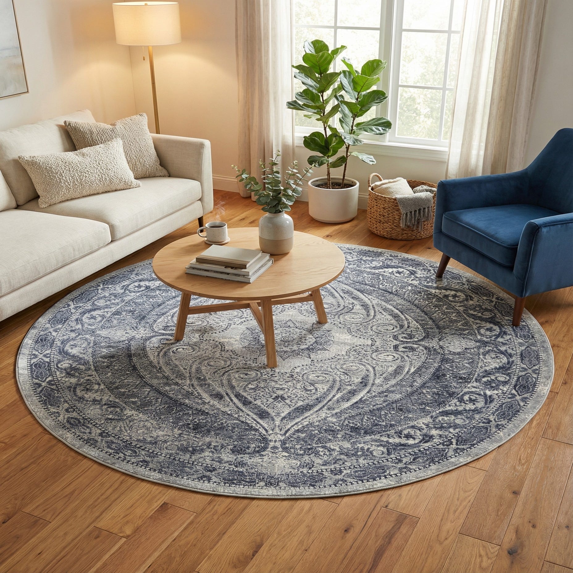 Machine made from 85% polypropylene and 15% chenille, the surface offers a pleasant, tactile contrast: chenille strands provide a soft, velvety hand while the polypropylene base keeps the pile resilient and low-profile. This round shape works well beneath a circular dining table, anchoring a seating area, or softening an entryway. Pair it with light wood furniture and neutral upholstery for a calm, coastal or transitional look, or layer with brass accents and navy pillows for a more tailored, traditional scheme.