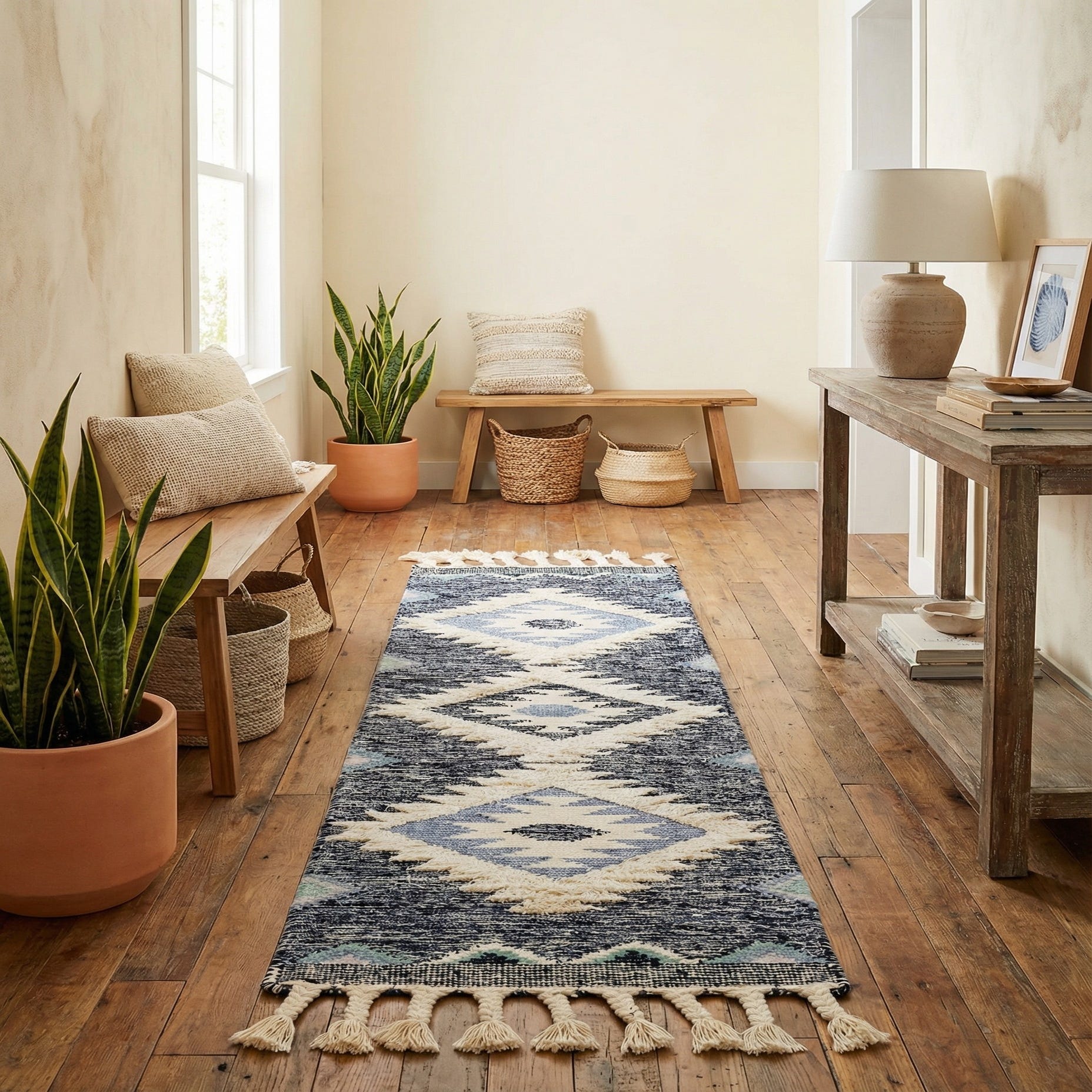 Use this runner to define a hallway or entryway, layer it along the side of a bed, or anchor a narrow kitchen aisle beneath a row of stools. It pairs well with warm wood floors and leather or natural-fiber furnishings, and complements modern farmhouse, bohemian, southwestern-inspired, or coastal-leaning interiors where a mix of texture and geometric pattern adds character.