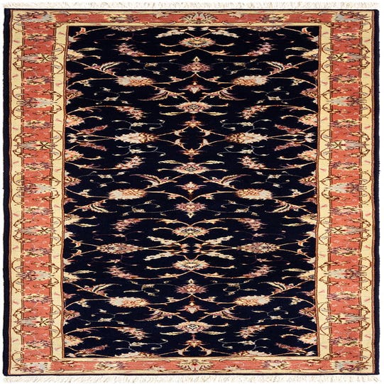 From the Tabriz collection, this hand-made wool and silk 8 ft runner brings a touch of elegance to any corridor or slim space within your home. It features a dark blue background that serves as a canvas for the ornate pattern of floral motifs and intricate details in hues of pink, brown, and olive. The border, adorned with similar floral designs on a contrasting light background, frames the central pattern creating a refined and harmonious symmetry.
