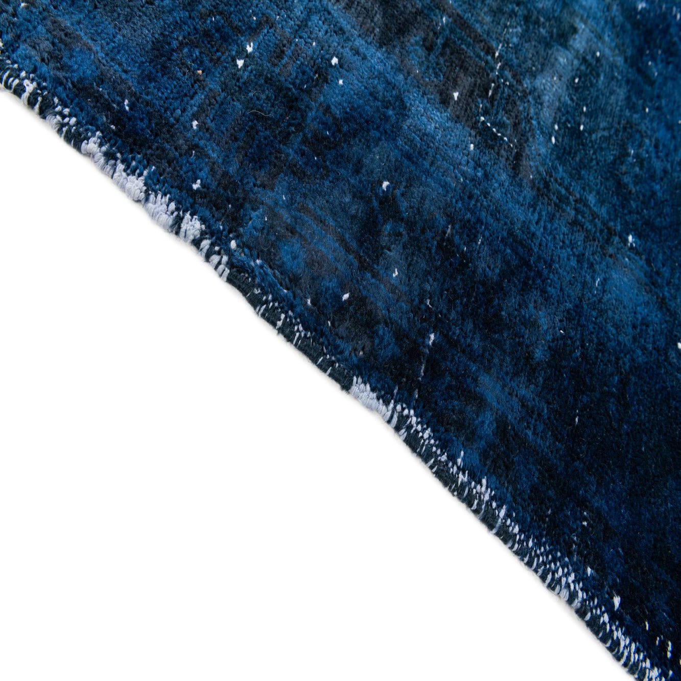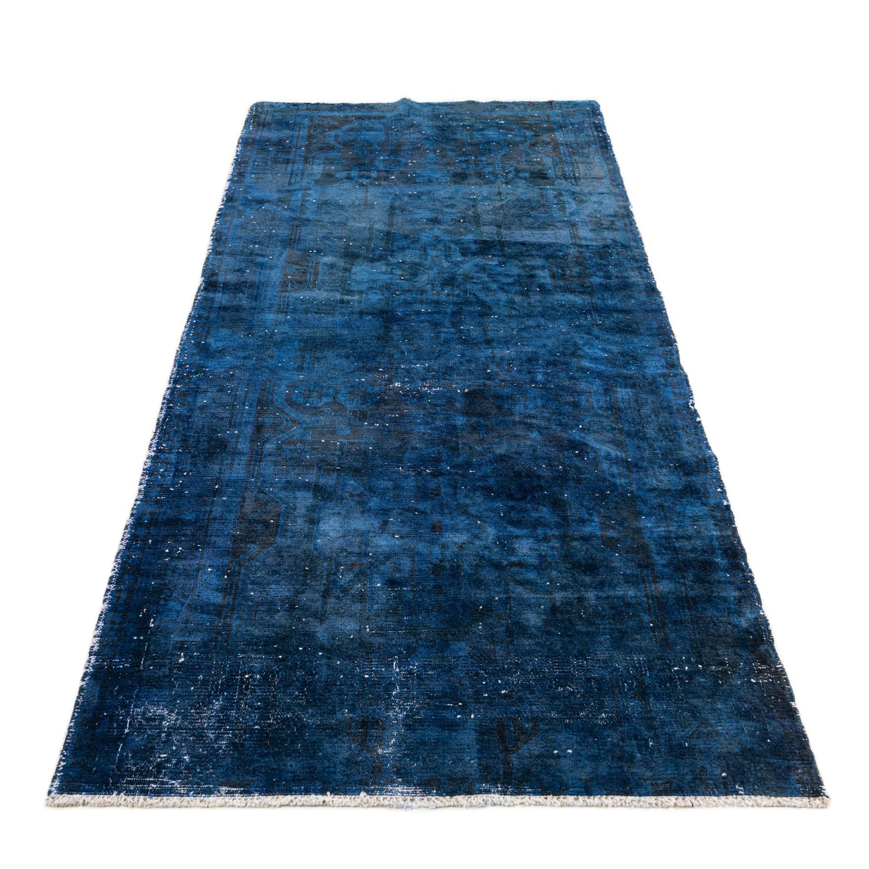 A distressed 8 ft runner rug in shades of deep blue, featuring a subtle Persian medallion pattern, ideal for a hallway or kitchen.