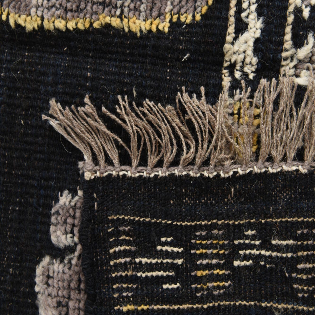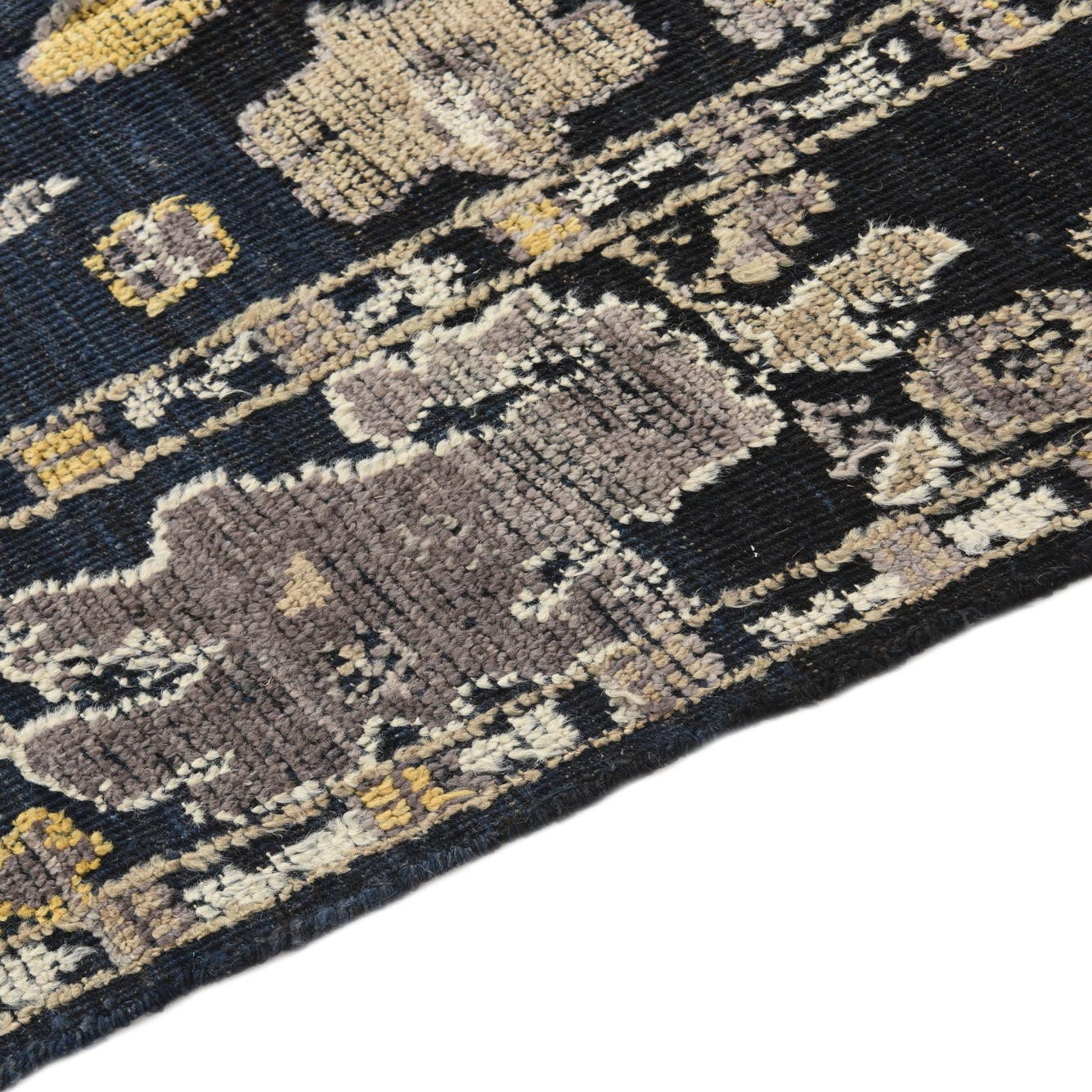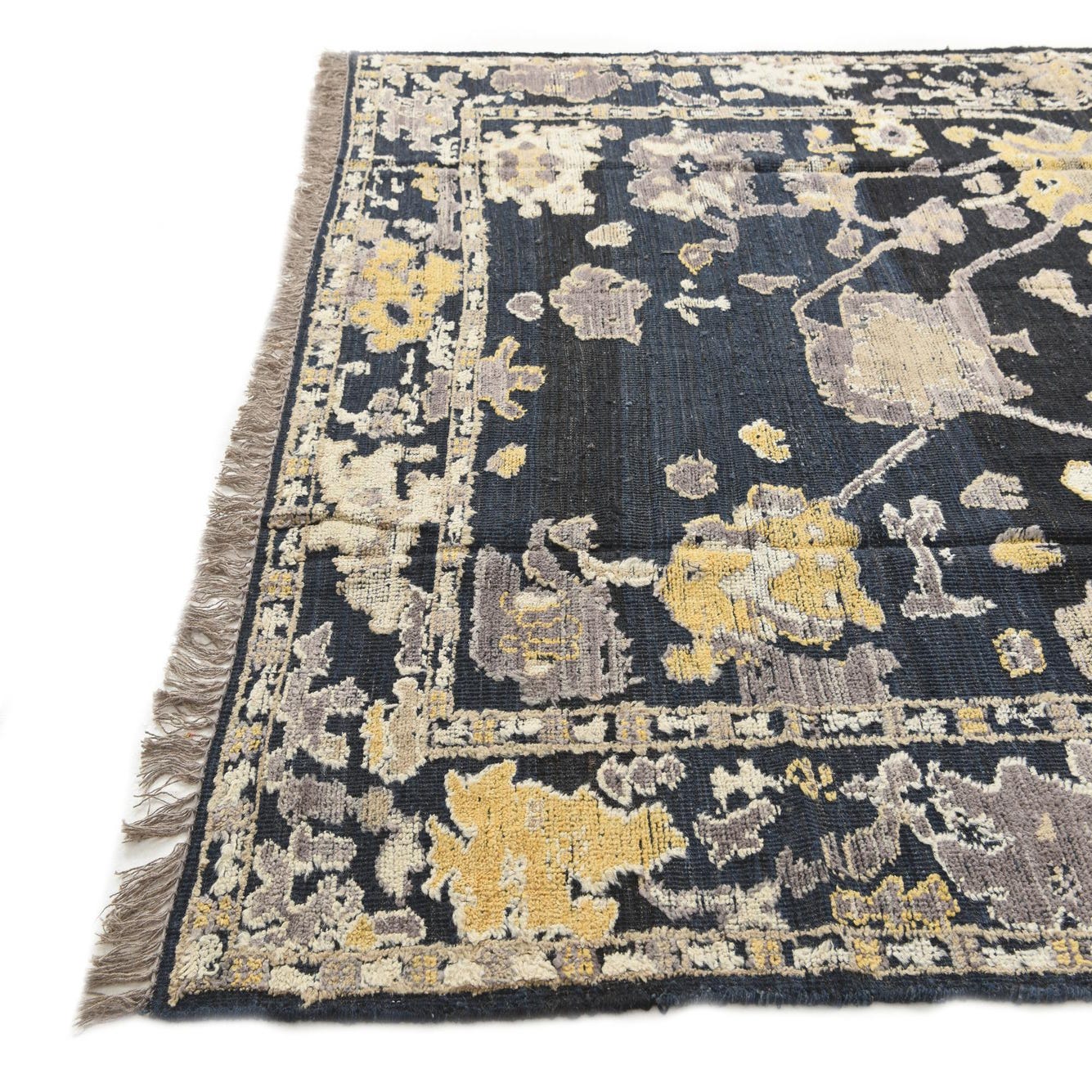 Primary color is Dark Blue. Colors in this rug include: Dark Blue, Ivory, Yellow, Gray.