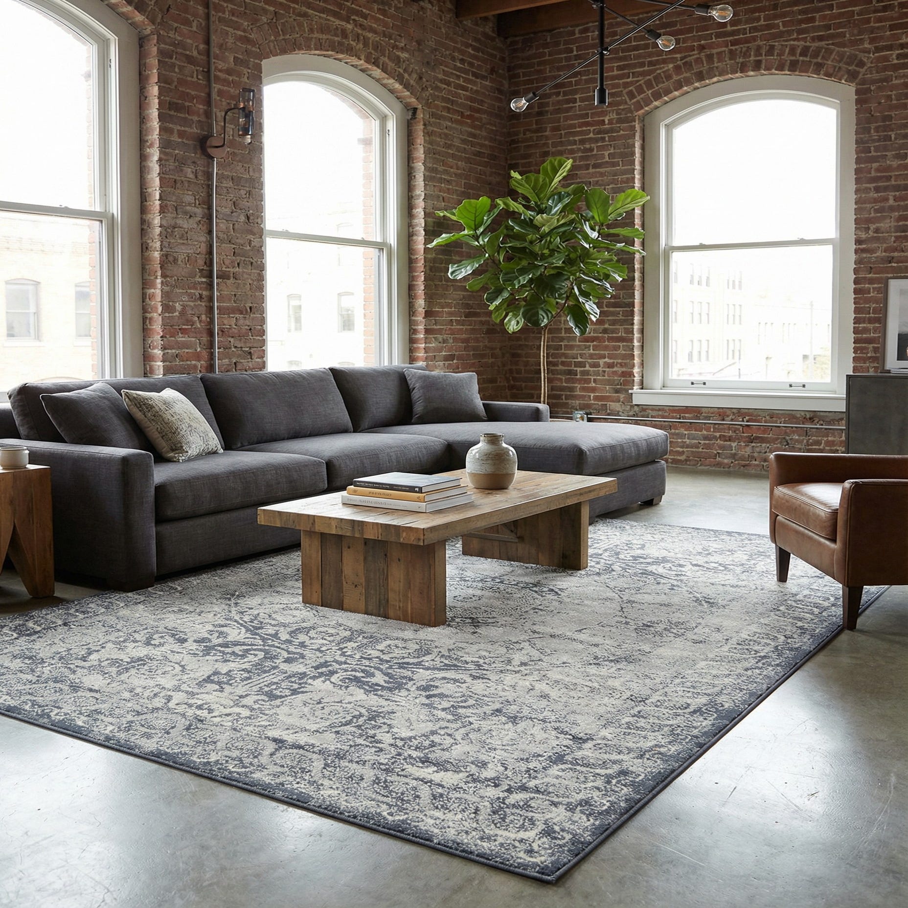 Use this rug to anchor a sofa grouping in the living room, beneath a dining table to introduce pattern without overwhelming, or at the foot of a bed for added warmth and depth. Its tonal navy, gray, and ivory palette complements transitional and modern-traditional interiors, navy-accented coastal schemes, or neutral farmhouse and Scandinavian rooms; pair it with warm woods, brushed metal accents, and crisp textiles for balanced, inviting spaces.