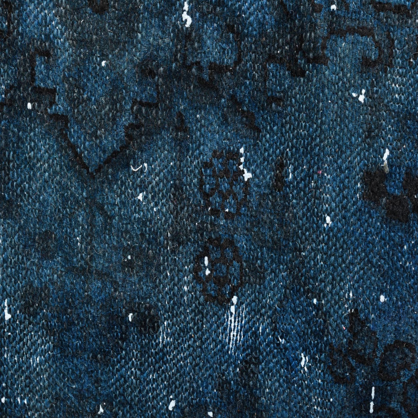 Hand-knotted of 100% wool, this rug presents a deep dark blue ground punctuated by black motifs and fine ivory flecks. A softened central medallion and layered floral ornamentation are mellowed by a vintage-wear effect, giving the pattern a lived-in, tonal quality. The darker border frames the field while the ivory speckles add lively contrast across the surface, and the overall palette leans richly toward the dark blue background with black accents that define the design.