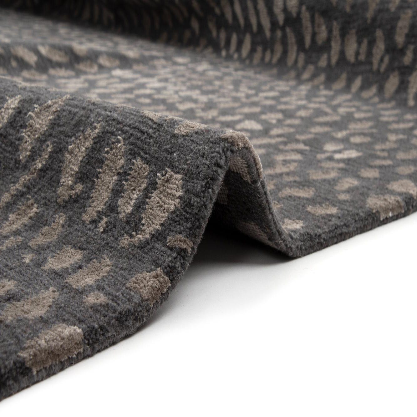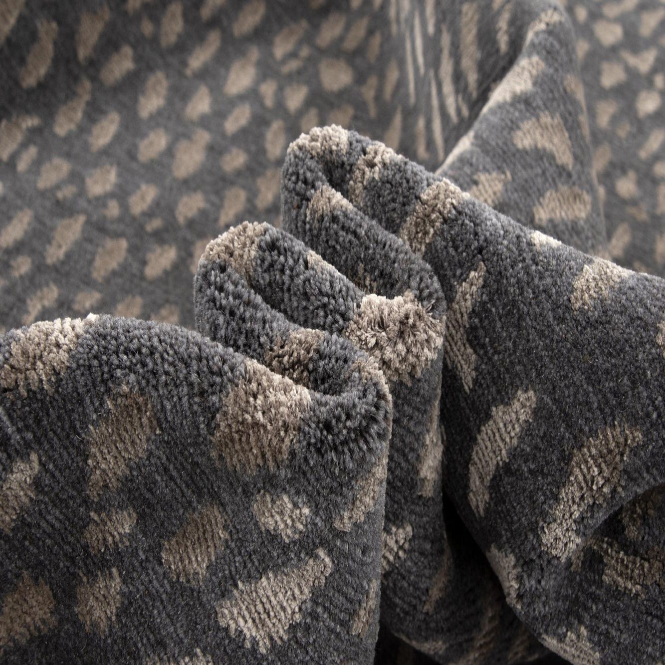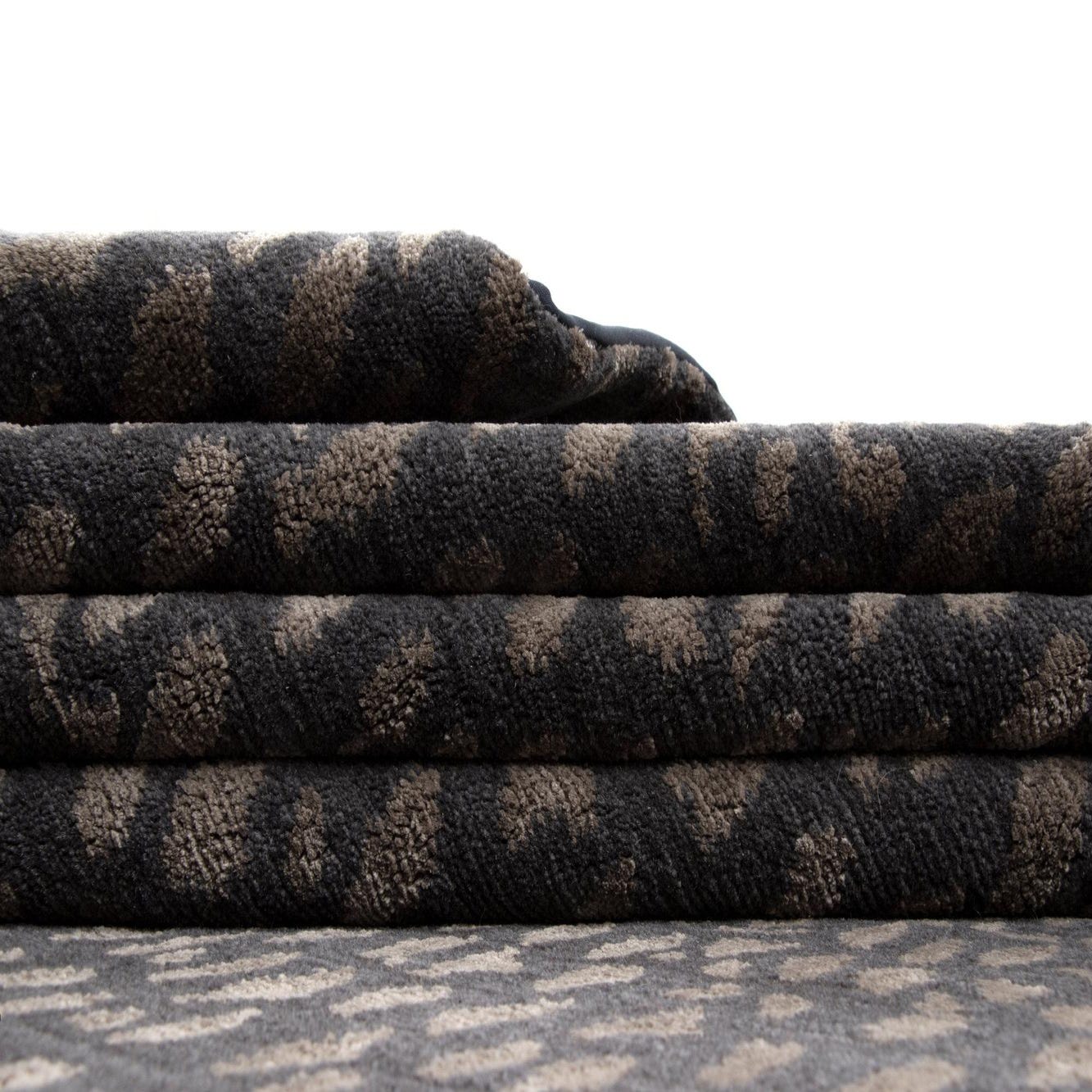 Hand Made of Wool & Silk, this rug has a soft, tactile face where the wool provides a cushiony depth and the silk threads create a subtle, low-luster sheen. The surface is finished with an all-over pebble pattern of small, irregular teardrop shapes in a lighter blue-gray that sit against a rich dark blue background, giving the piece quiet movement and layered depth without a formal border or central motif.