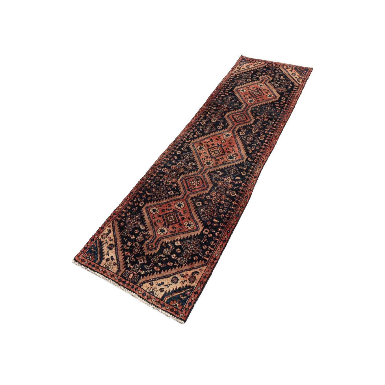 A 9 ft Hamedan runner rug in blue and terracotta with a tribal Persian pattern, ideal for hallways.