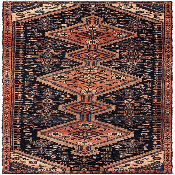 Crafted from 100% wool, the Hamedan 9 Ft Runner is a testament to timeless hand-made quality and rich, enduring style. Bearing a bold, geometric pattern throughout its length, this runner features a medley of angular and diamond shapes, adorned with meticulously detailed motifs that draw inspiration from traditional Persian designs. Its primary color is a sophisticated dark blue, which provides a deep and versatile background for the accents in pink, cream, and brown that bring warmth and vibrancy to the rug.