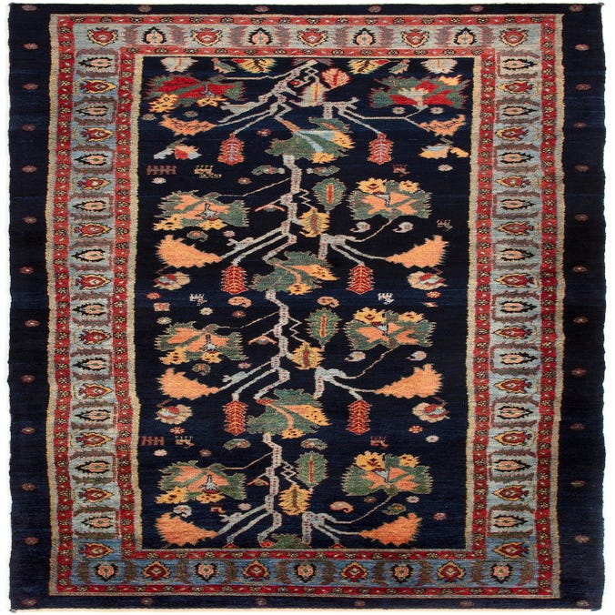 The Luribaft collection features a hand-made wool 9 Ft Runner rich in both history and style. Boasting a dark blue background, the runner is adorned with intricate patterns that draw inspiration from traditional motifs. The design is characterized by a symmetrical arrangement of botanical elements and stylized fauna, rendered in a palette that includes shades of orange, olive green, and sky blue, accented with pops of white and burgundy for contrast.