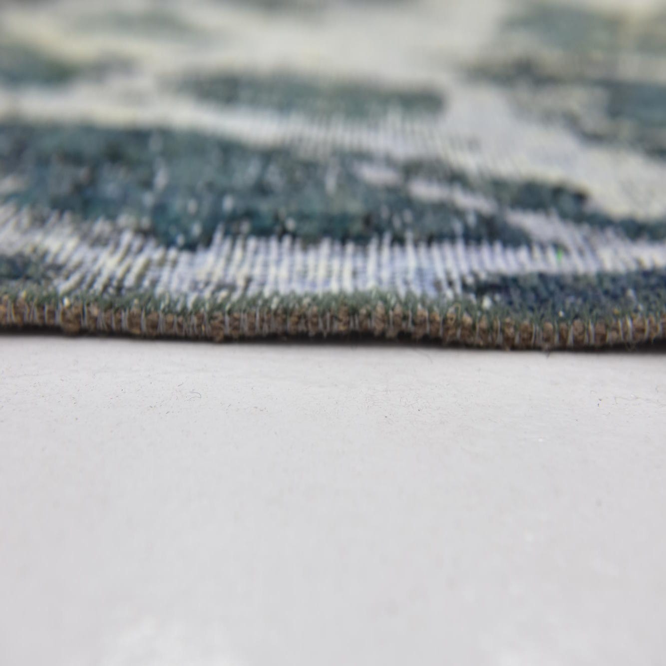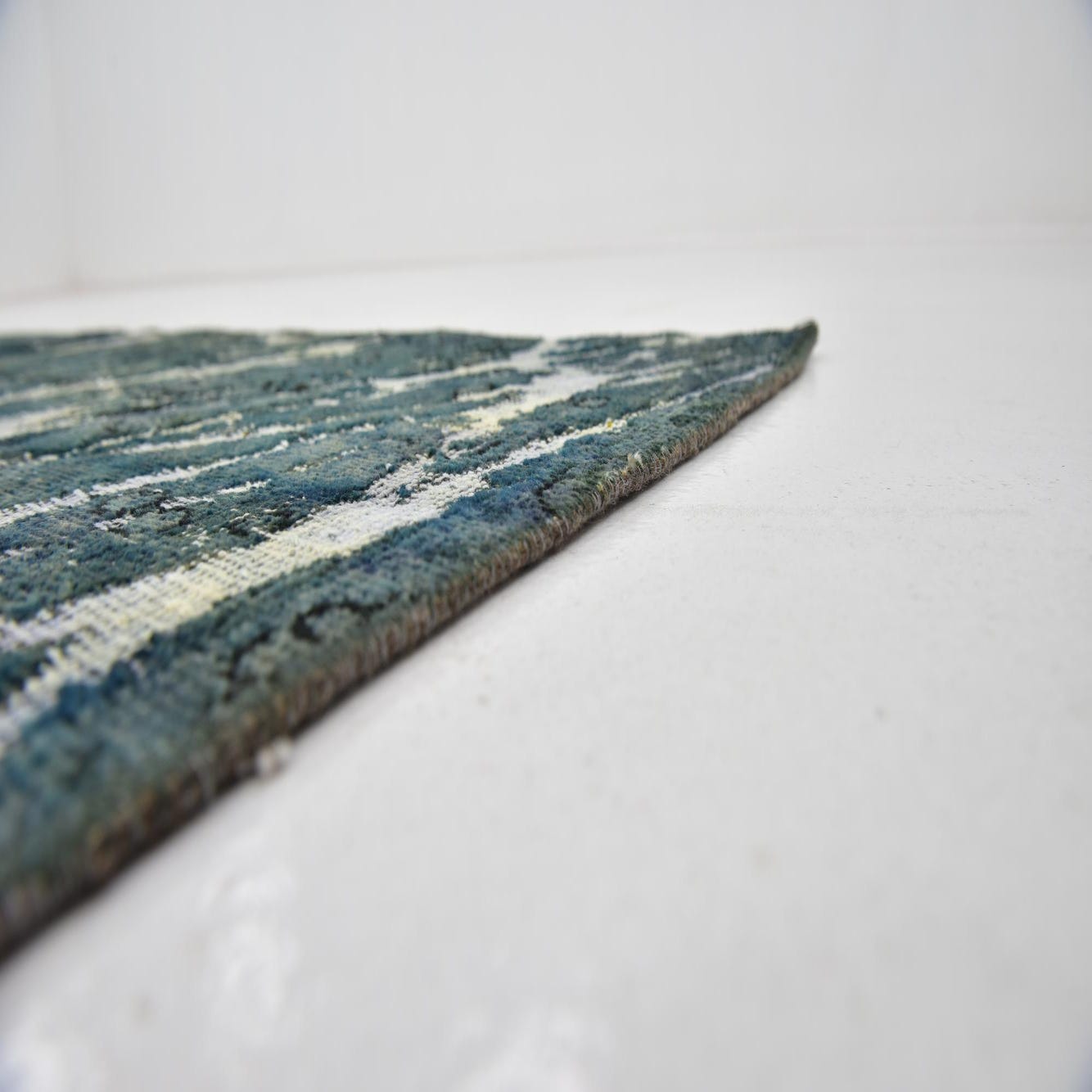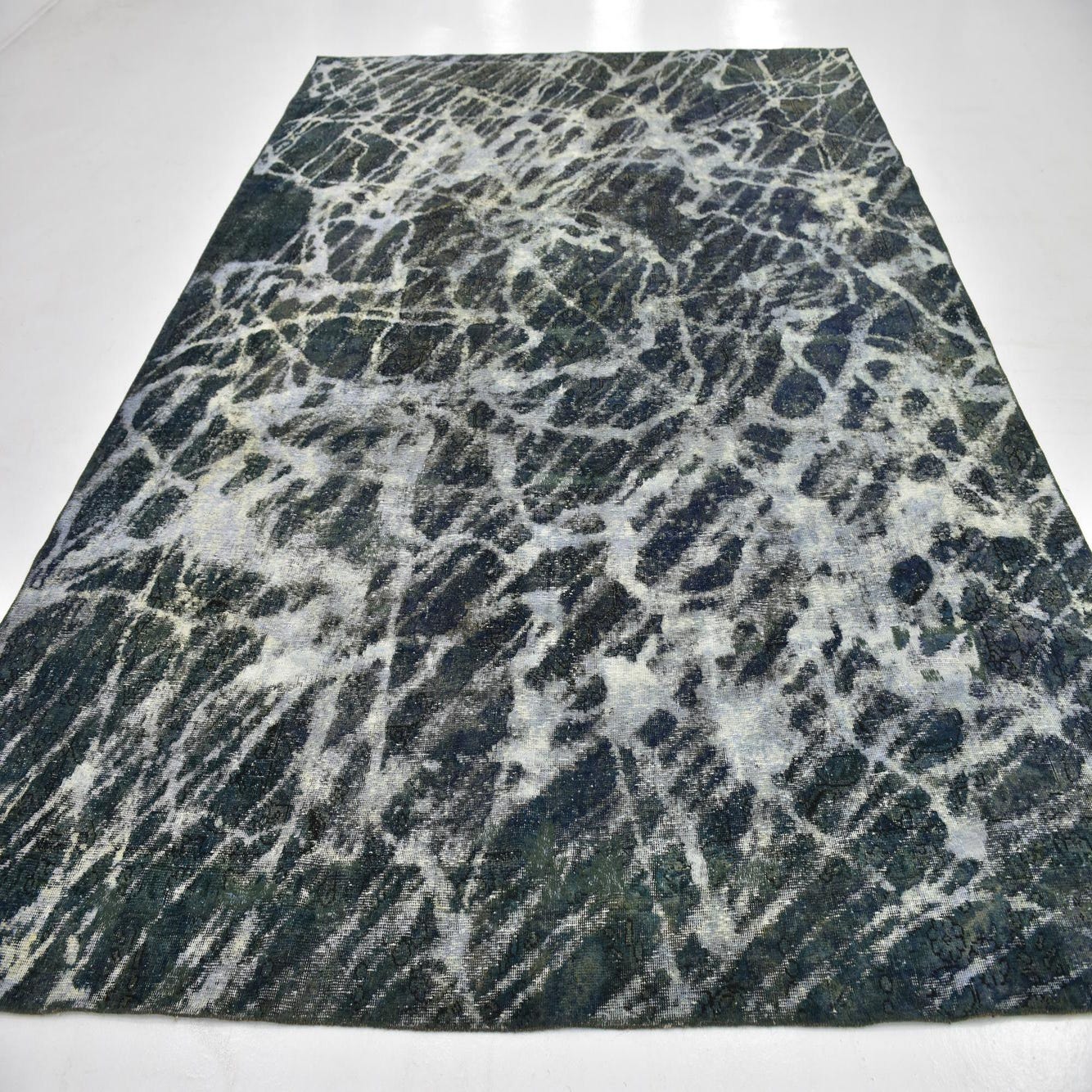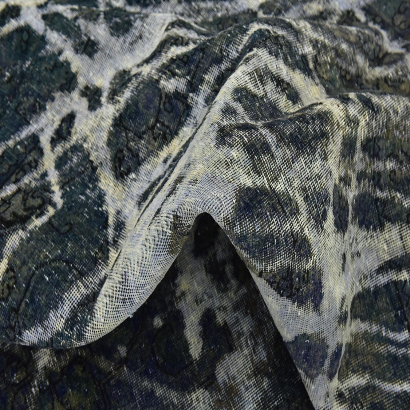 A 9x11 rectangular indoor rug with an abstract, distressed blue and white pattern, featuring subtle Persian motifs.