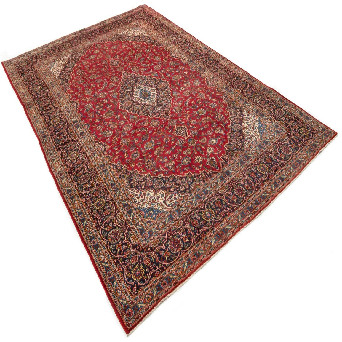 A rectangular 9x12 Kashan Persian rug with a red field, intricate floral motifs, and a dark blue border.