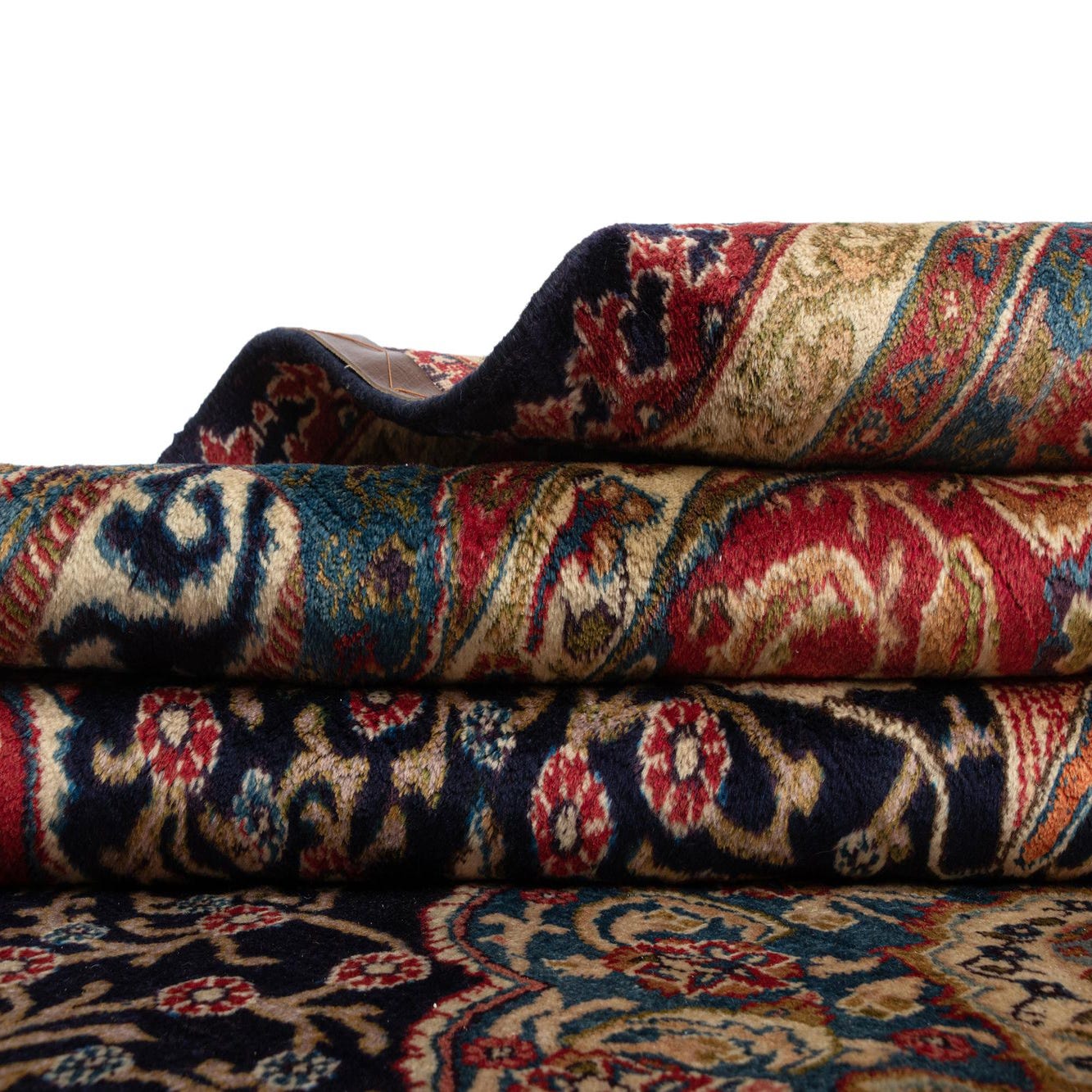 A large 9x12 rectangular Kashmar Persian rug featuring intricate floral and medallion patterns in rich blues, reds, and creams.