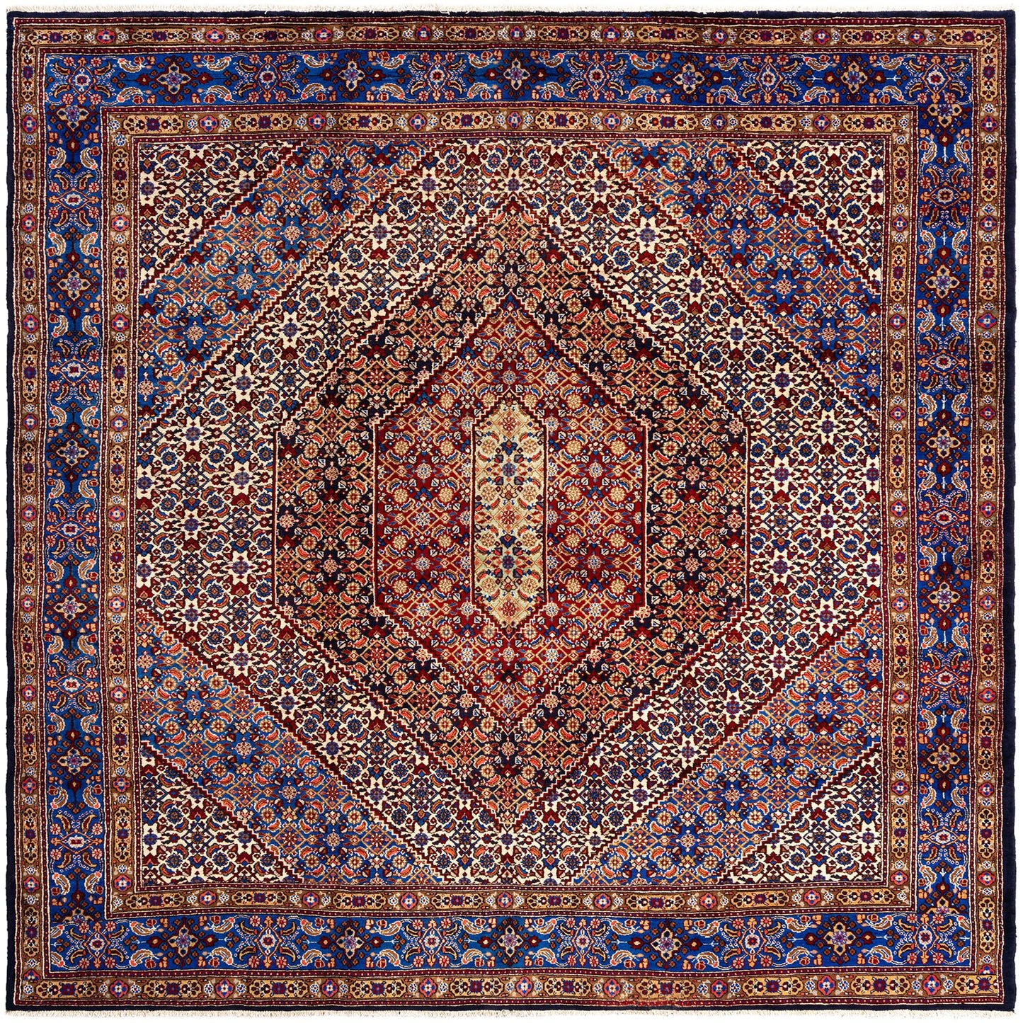 A 9x12 rectangular Persian rug with a central diamond medallion in reds, creams, and blues, surrounded by intricate floral patterns and a wide blue border.