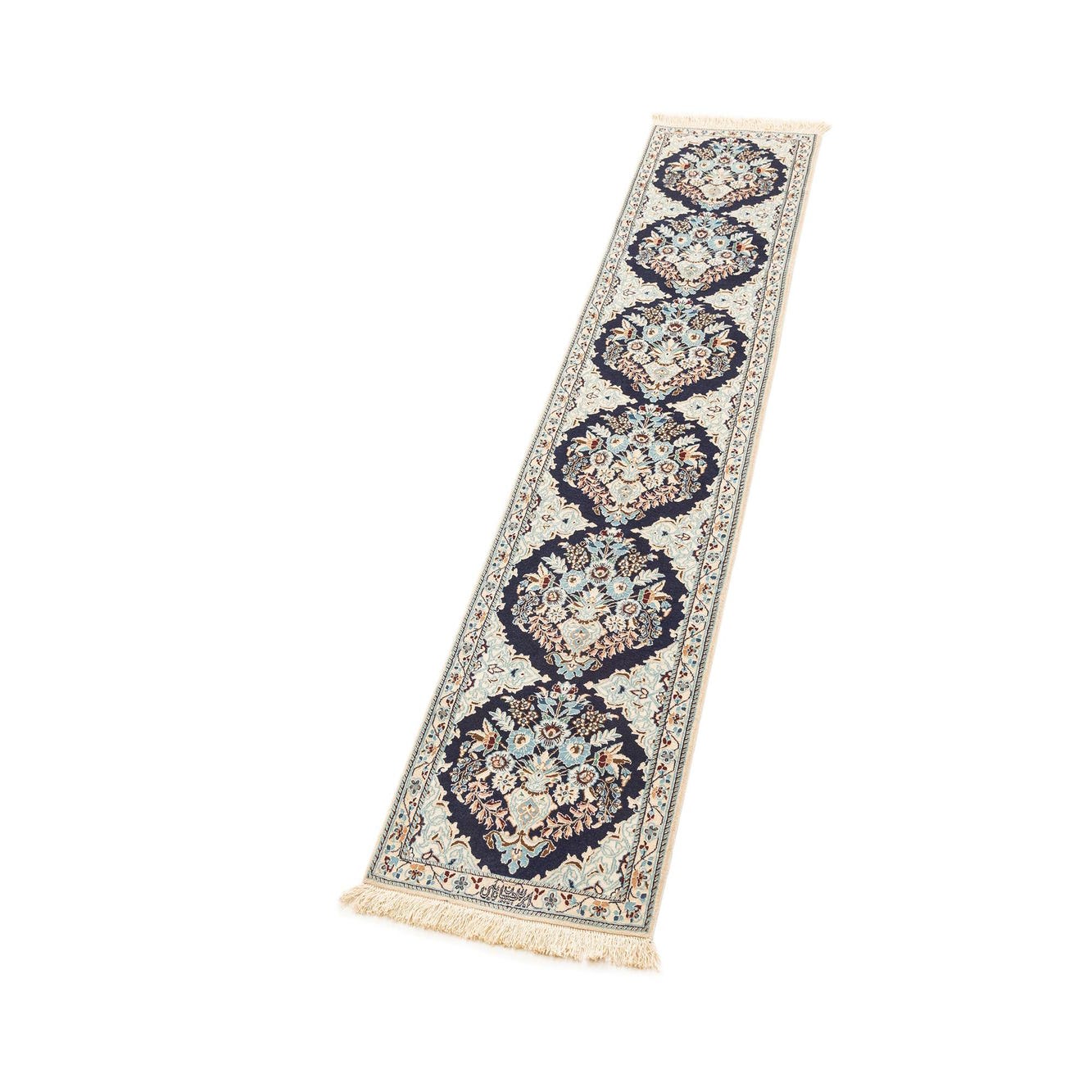 A handmade rectangular Persian runner rug featuring an intricate floral pattern in shades of blue, cream, and hints of red on a dark blue background, with cream fringe.