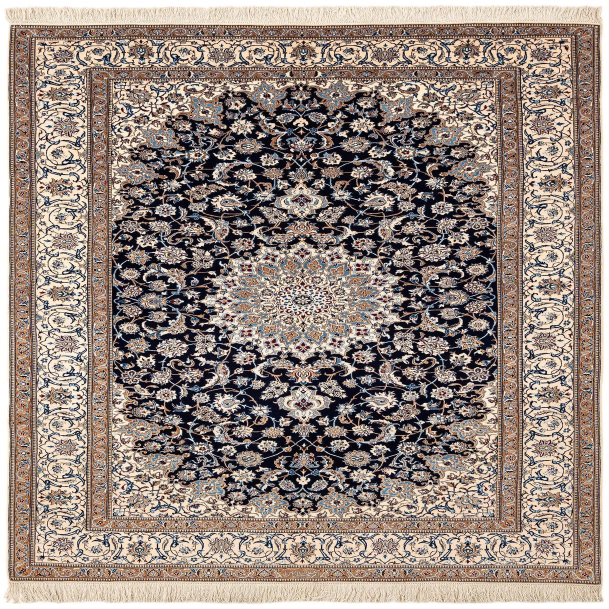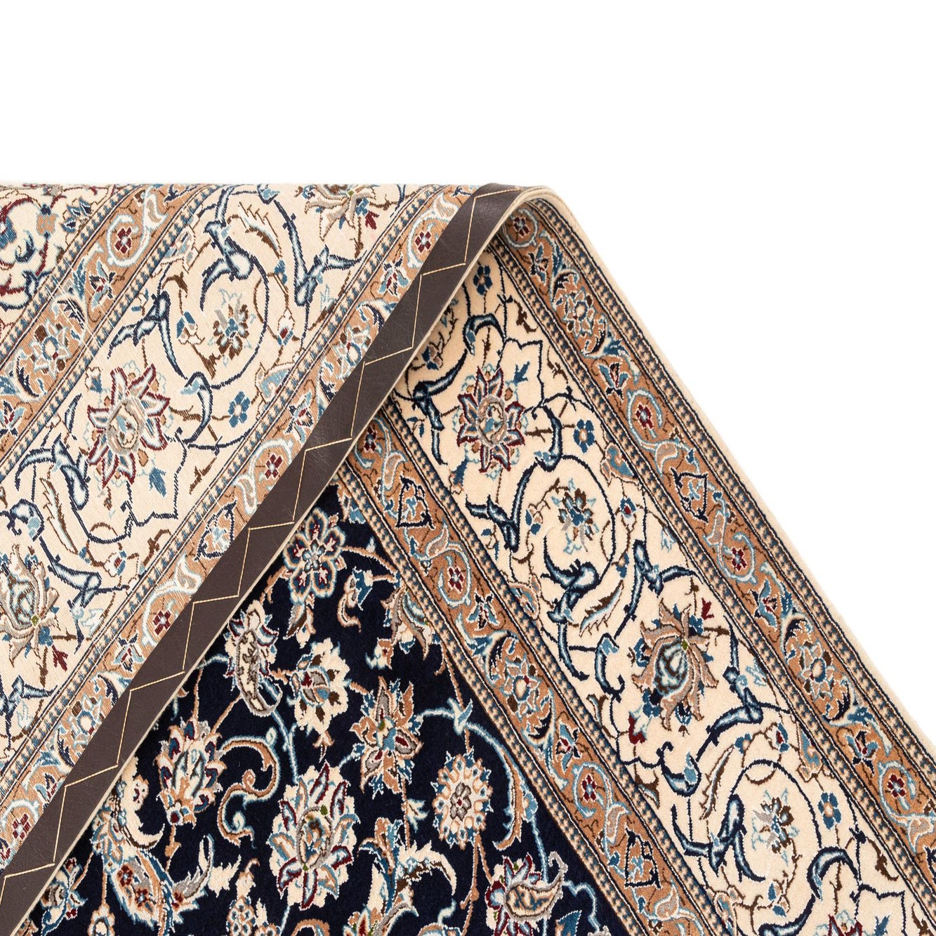Hand-knotted, handmade wool in a rectangular format, this rug centers on a finely detailed medallion set against a deep dark blue field. Delicate floral vines and arabesque motifs radiate outward in a tightly worked pattern, while a contrasting ivory border frames the composition with repeating palmettes and scrolling tendrils. Accents of pale blue, warm beige and soft tan thread the design, giving the overall palette a measured, layered look that emphasizes the clarity of each motif.