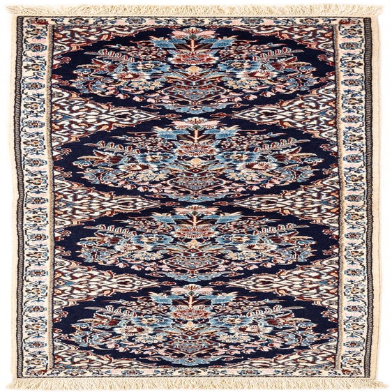 A handmade rectangular Persian rug from the Nain collection, featuring a deep blue field with intricate floral and medallion patterns in shades of light blue, pink, and cream, bordered by a cream frame with delicate motifs, and finished with cream fringes.