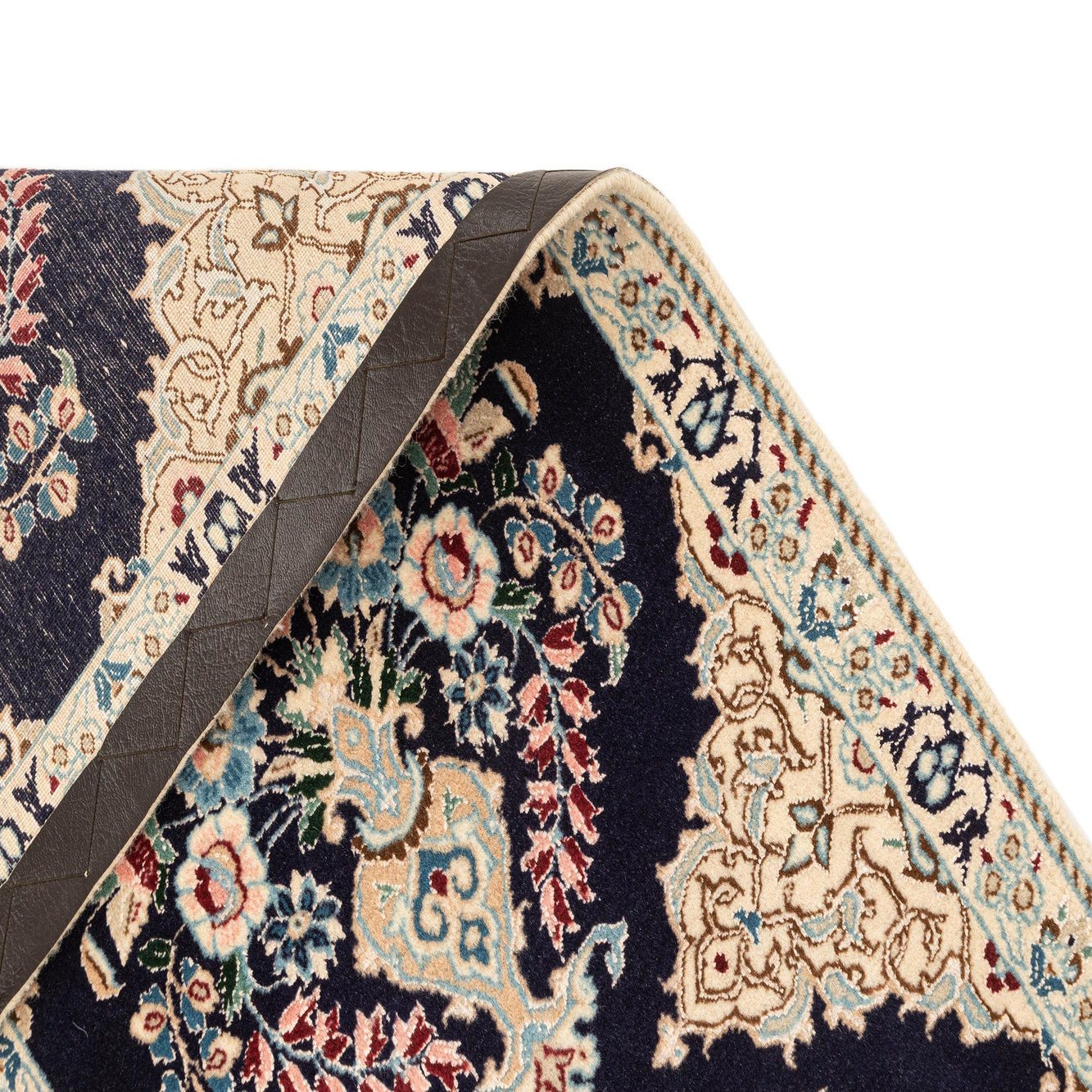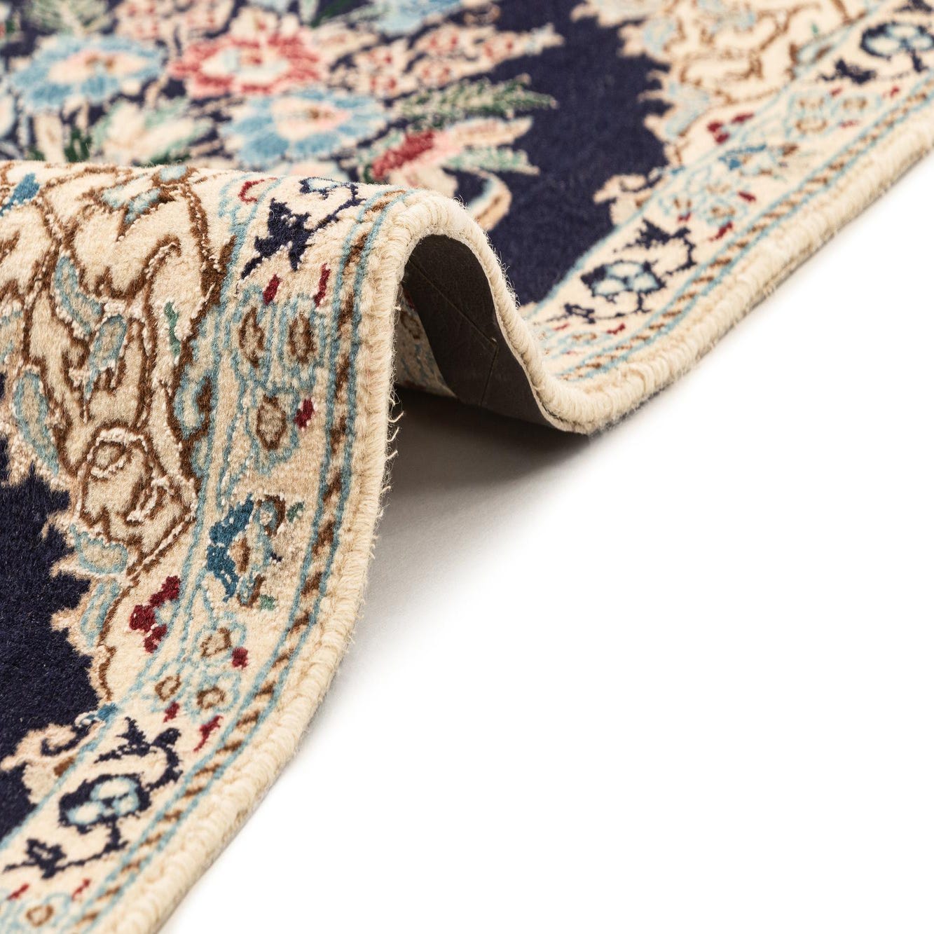 A rectangular handmade Persian rug featuring a navy blue background with intricate floral and medallion patterns in shades of blue, red, and cream.