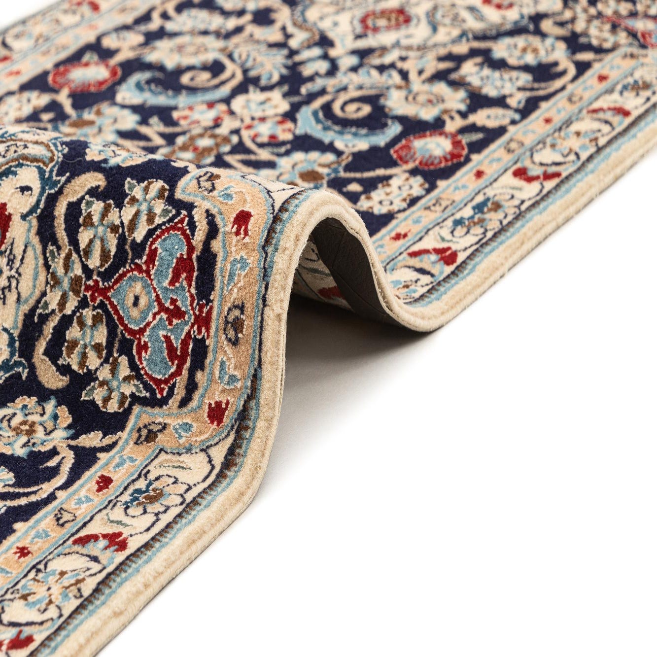 A handmade rectangular indoor rug featuring a traditional Persian pattern in deep blues, creams, and reds, with fringe.