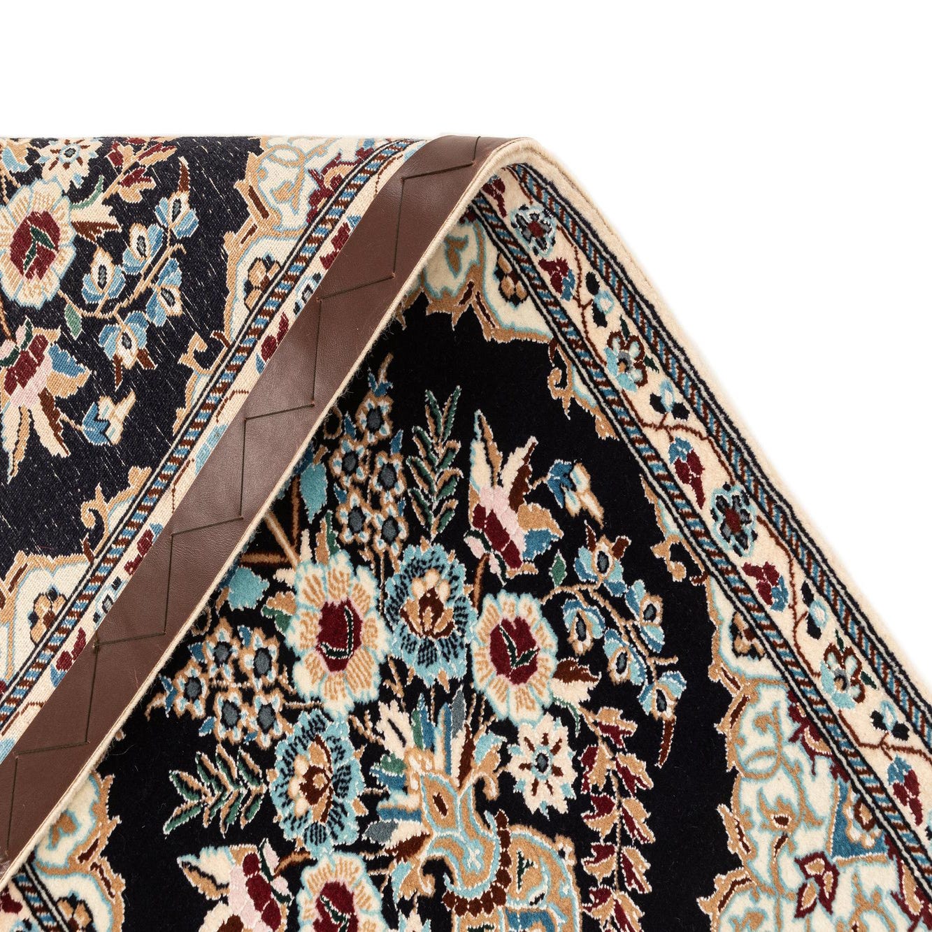A handmade rectangular Persian runner rug featuring an intricate floral medallion pattern in blues, creams, and reds on a dark navy background, with cream fringe.