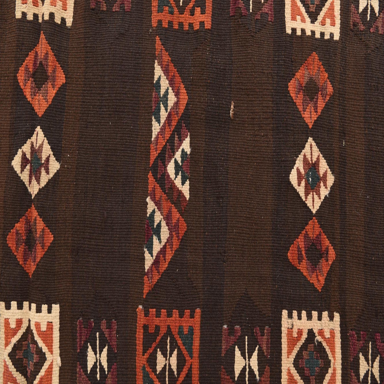 Primary color is Dark Brown. Colors in this rug include: Dark Brown, Ivory, Orange, Brown, Burgundy.