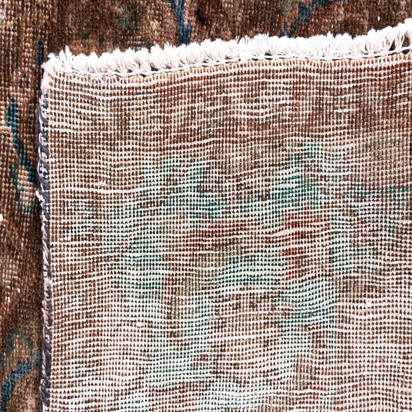 A 10 ft runner rug in brown and tan with a faded Persian medallion pattern in teal and rust, suitable for a hallway.