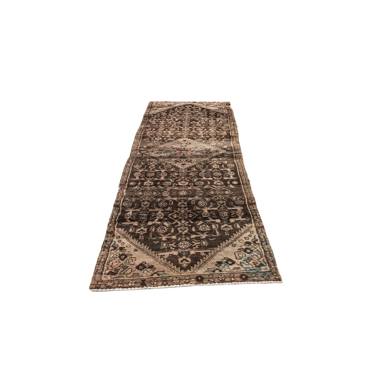 A 10 ft runner rug in shades of brown and tan, featuring a distressed Persian medallion pattern, ideal for a hallway.