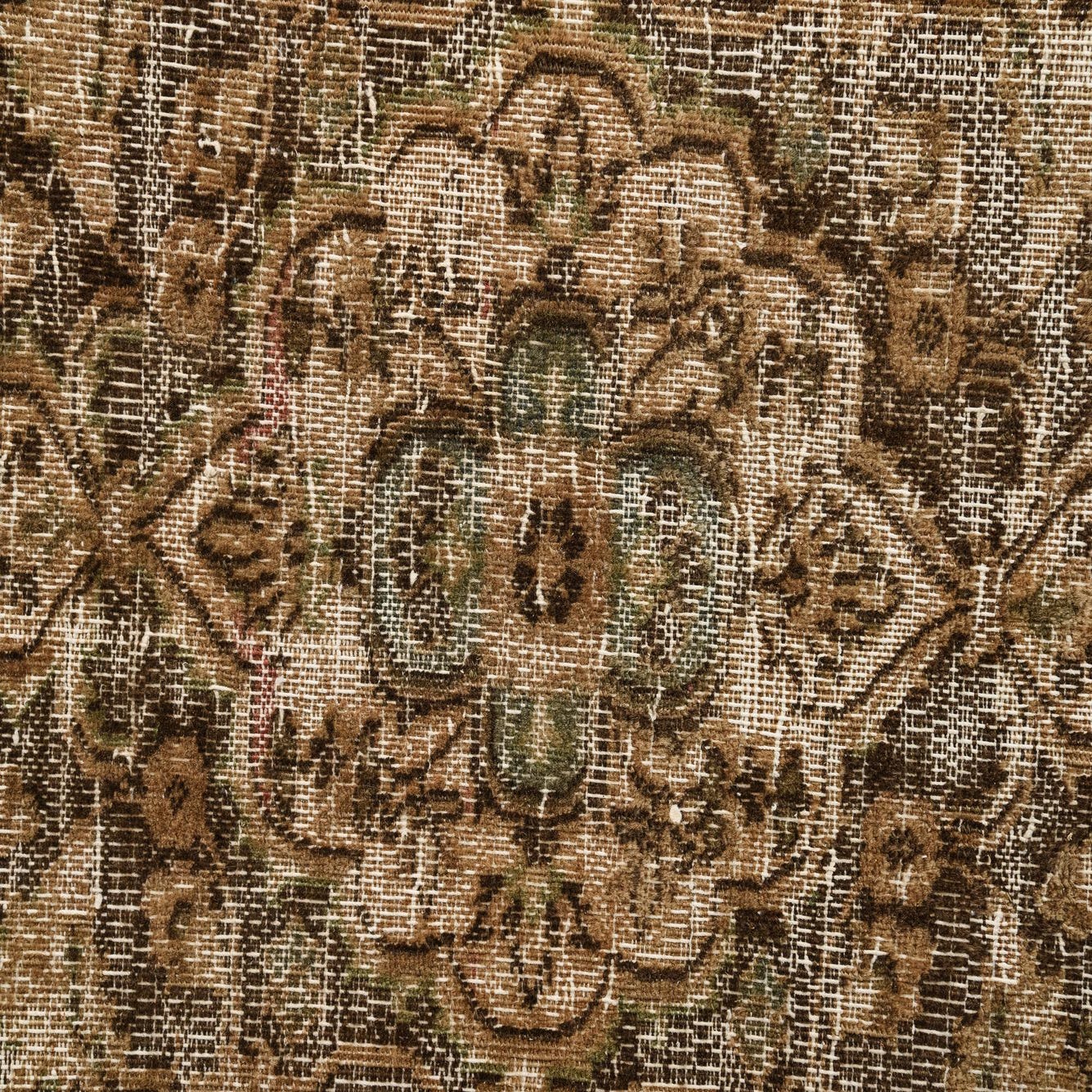 A traditional medallion and floral pattern sits across a dark brown background, with layered beige and brown motifs that create a softly distressed, timeworn look. Hand-knotted in 100% wool, the surface has a low sheen and a dense, tactile pile you can feel underfoot; subtle variations in color and pile height add depth and a lived-in texture without detracting from the design’s clarity. An ornate border frames the field, lending structure and a classic sensibility to the overall composition.