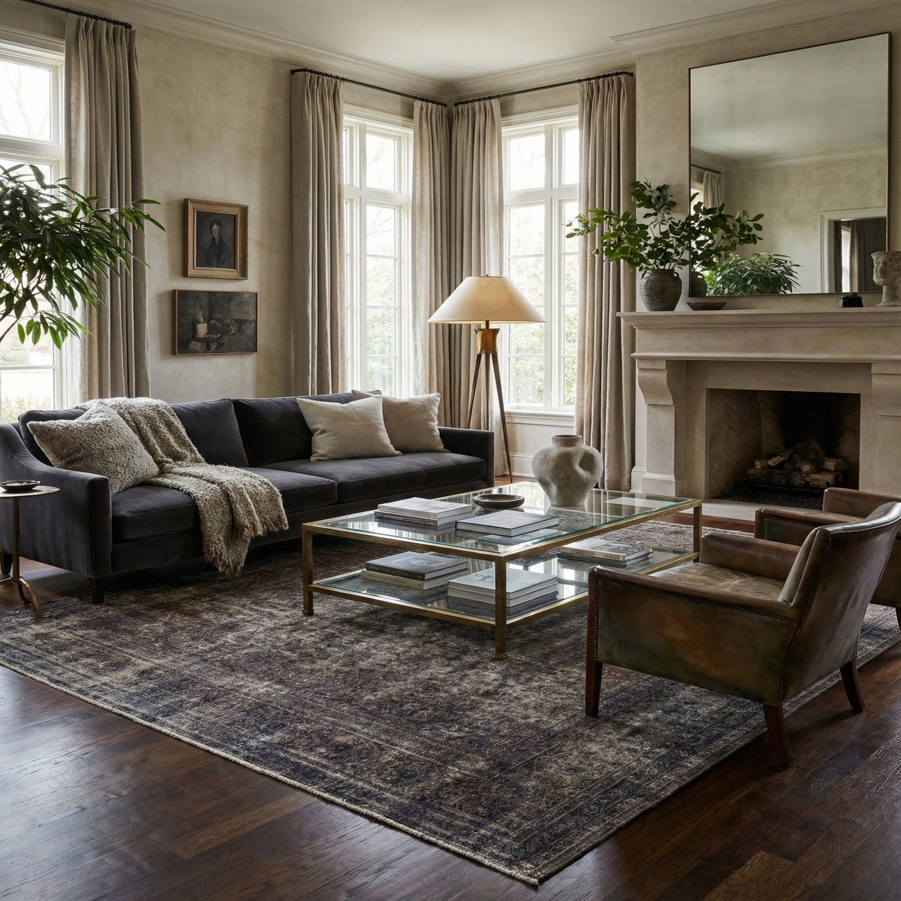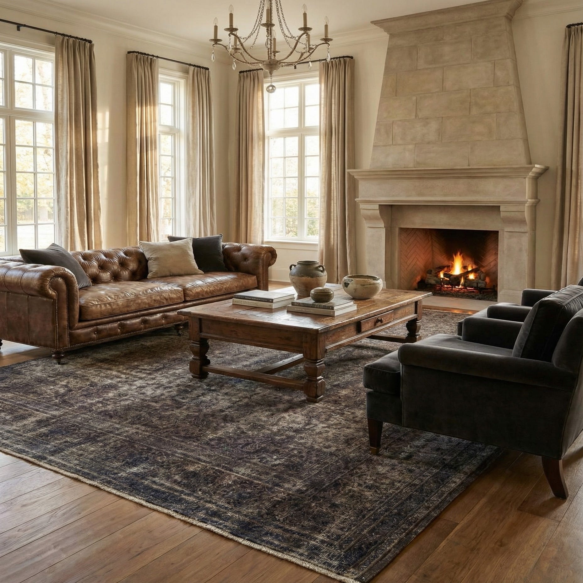 A 10x12 rectangular brown and tan Persian-style wool rug with a distressed vintage medallion pattern.