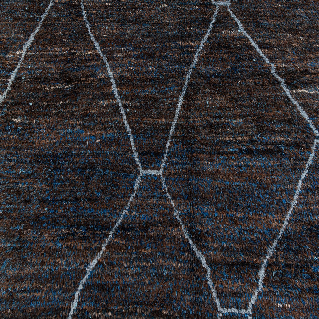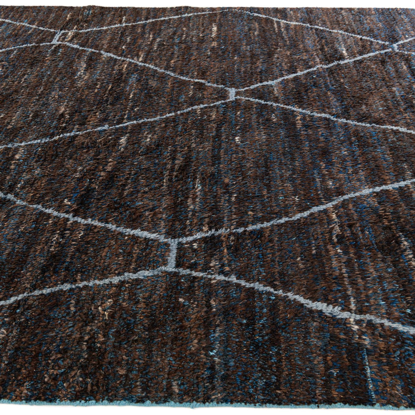 A 10x13 rectangular brown shag rug with a modern tribal diamond pattern in light blue, suitable for a living room.