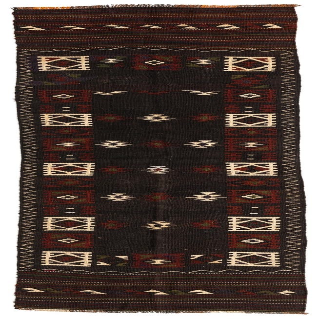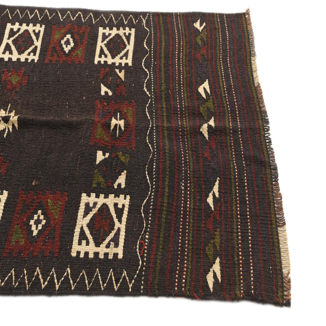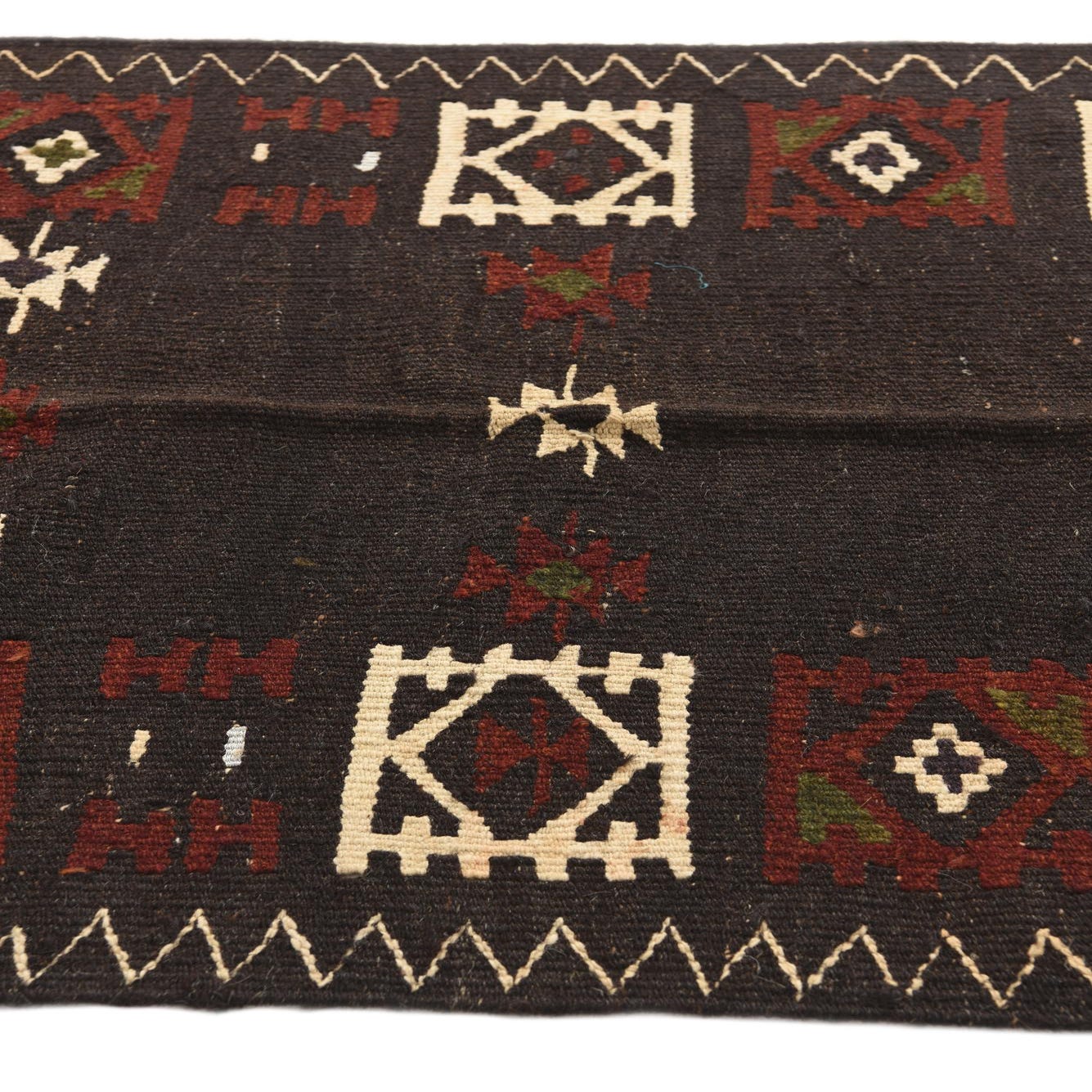 Primary color is Dark Brown. Colors in this rug include: Dark Brown, Ivory, Olive, Red.