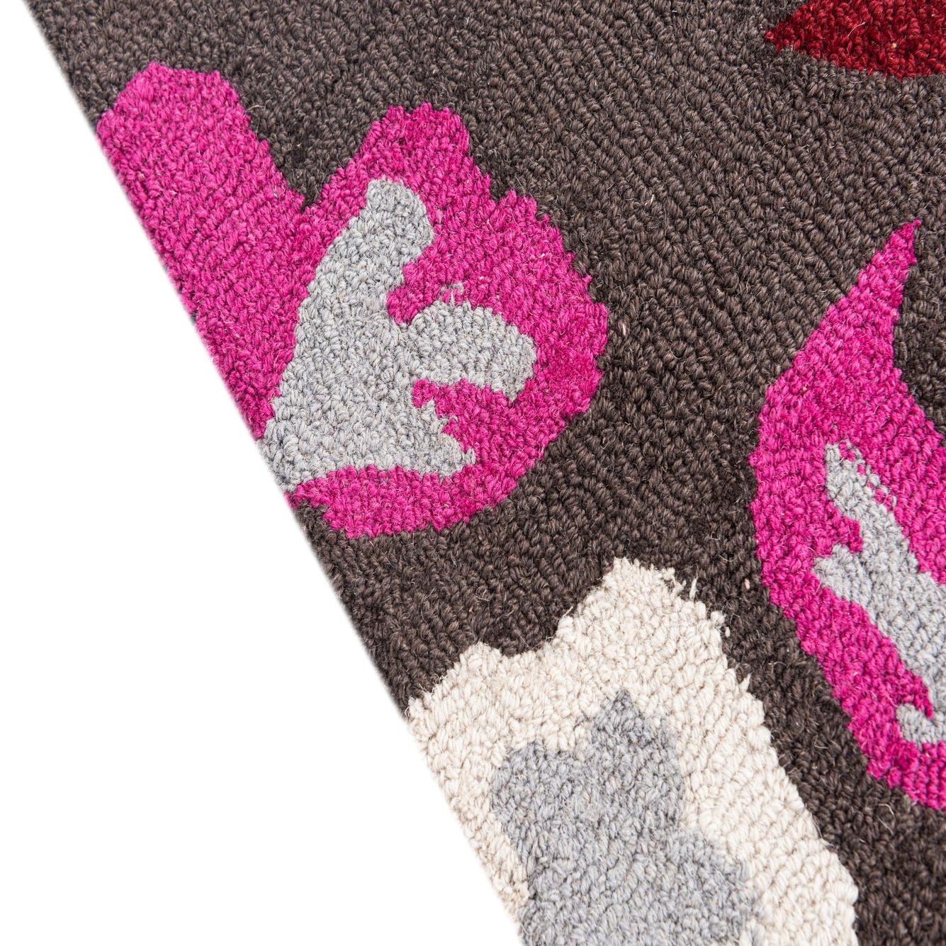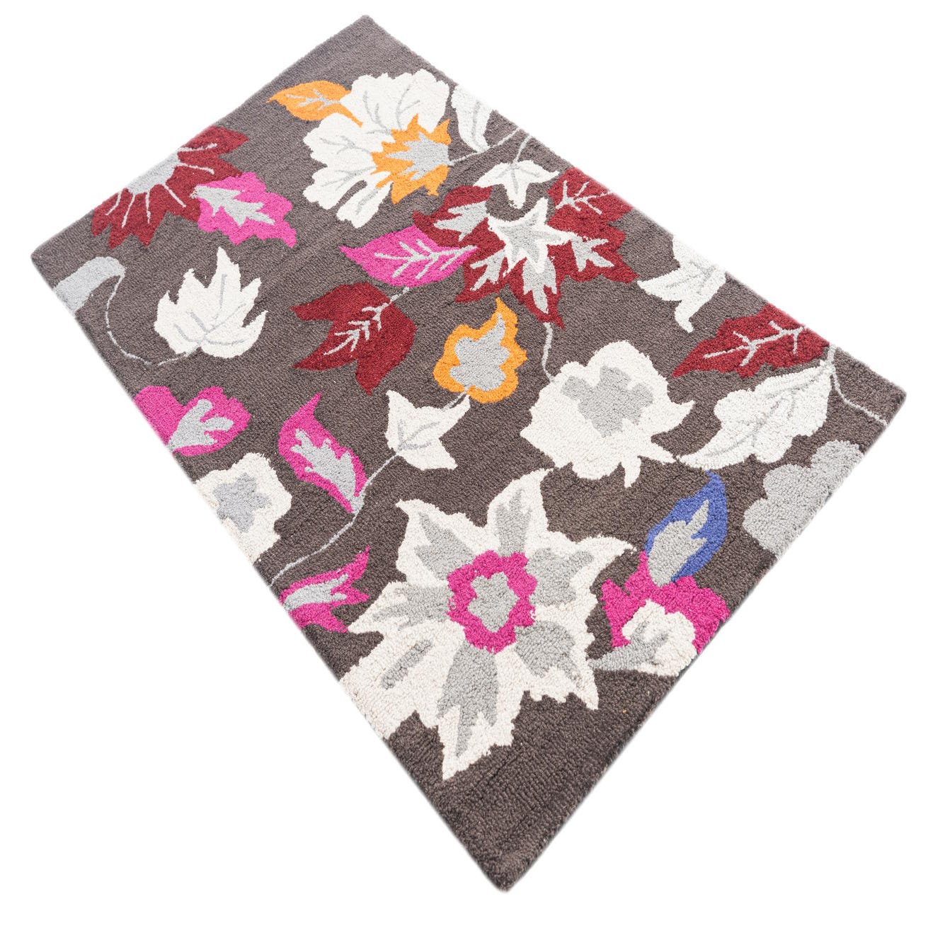 A 3x5 rectangular modern wool rug with a dark brown background and large, colorful floral and leaf patterns in cream, grey, fuchsia, orange, and deep red.