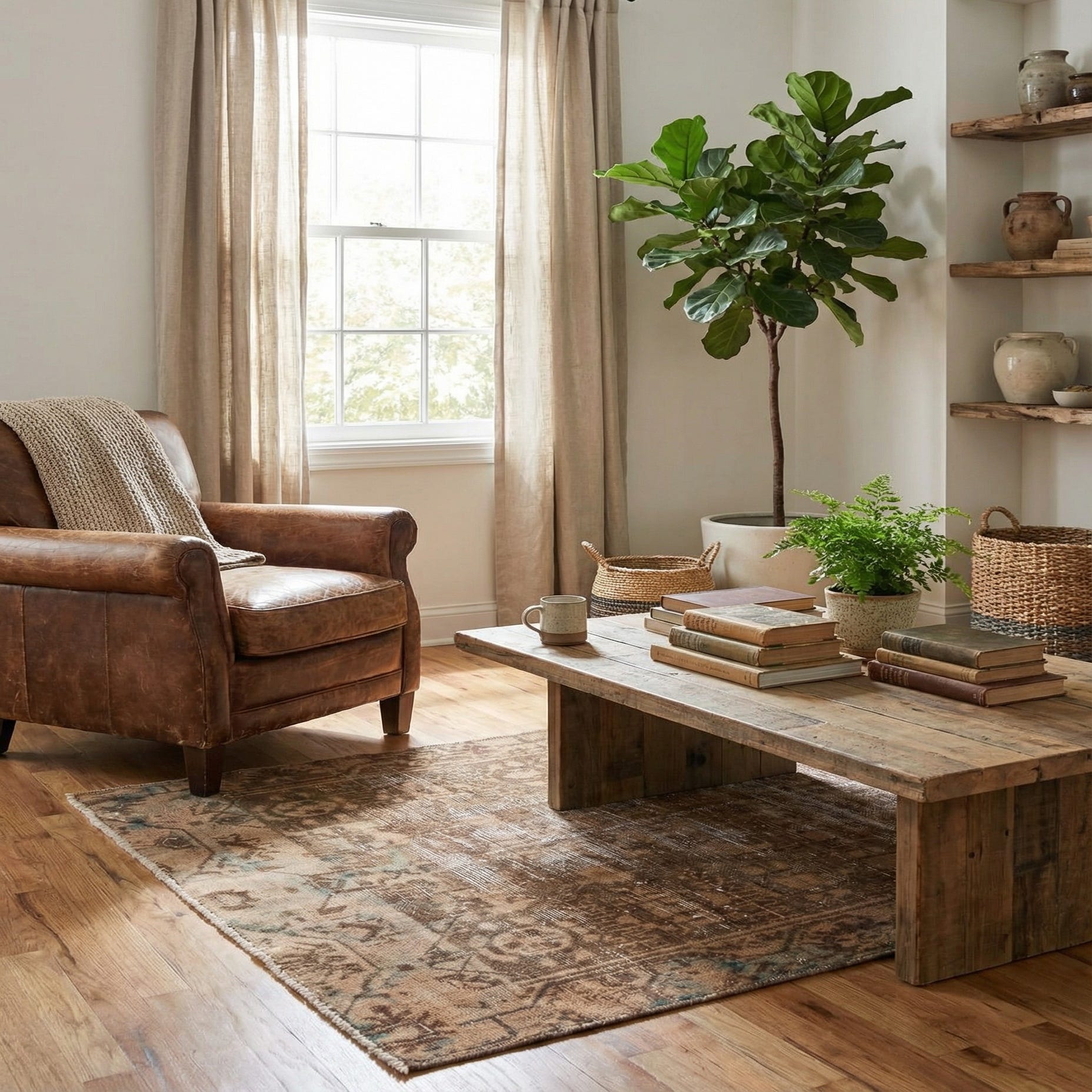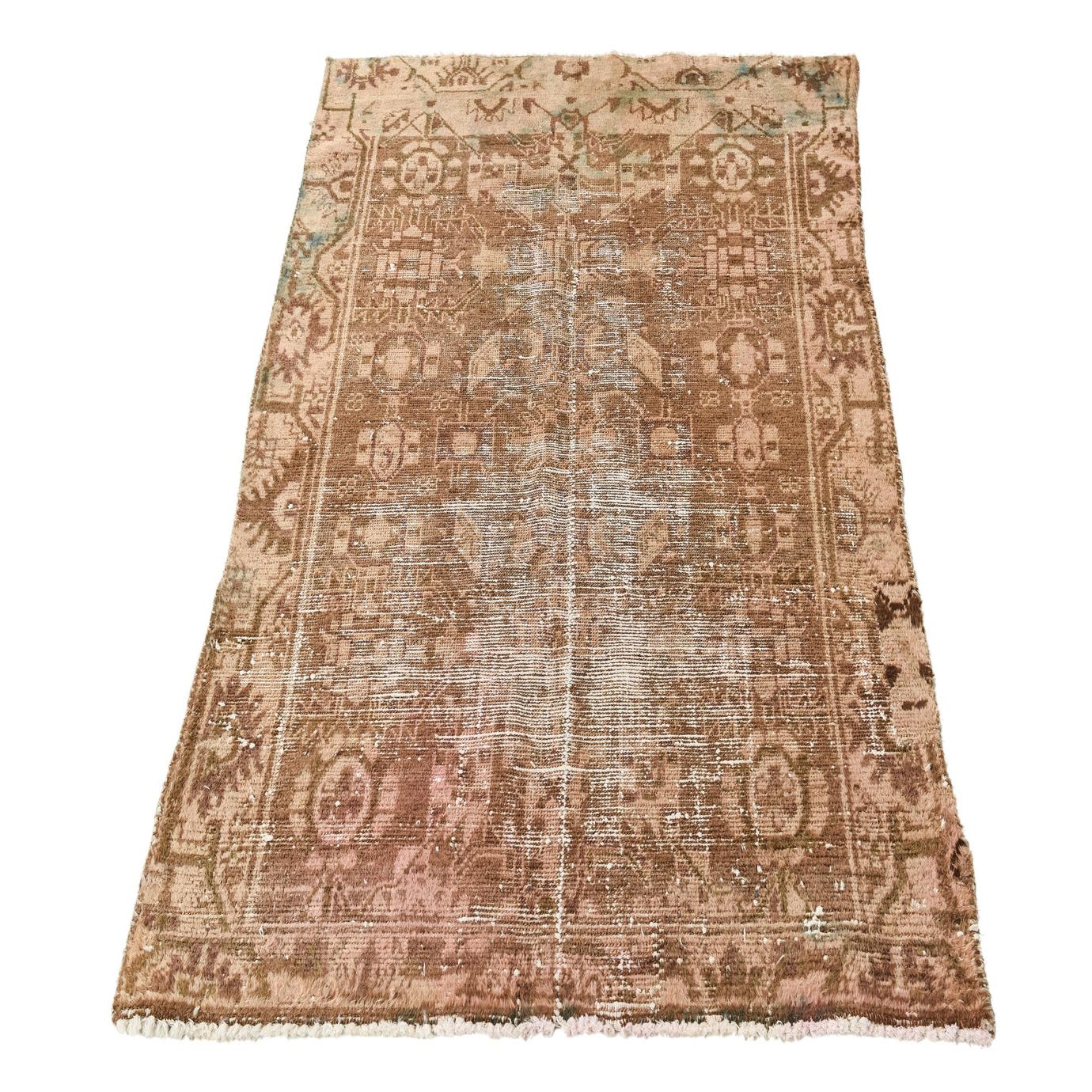 A 3x5 rectangular brown and tan Persian-style wool rug with a distressed, vintage look, featuring intricate patterns and a flat pile.