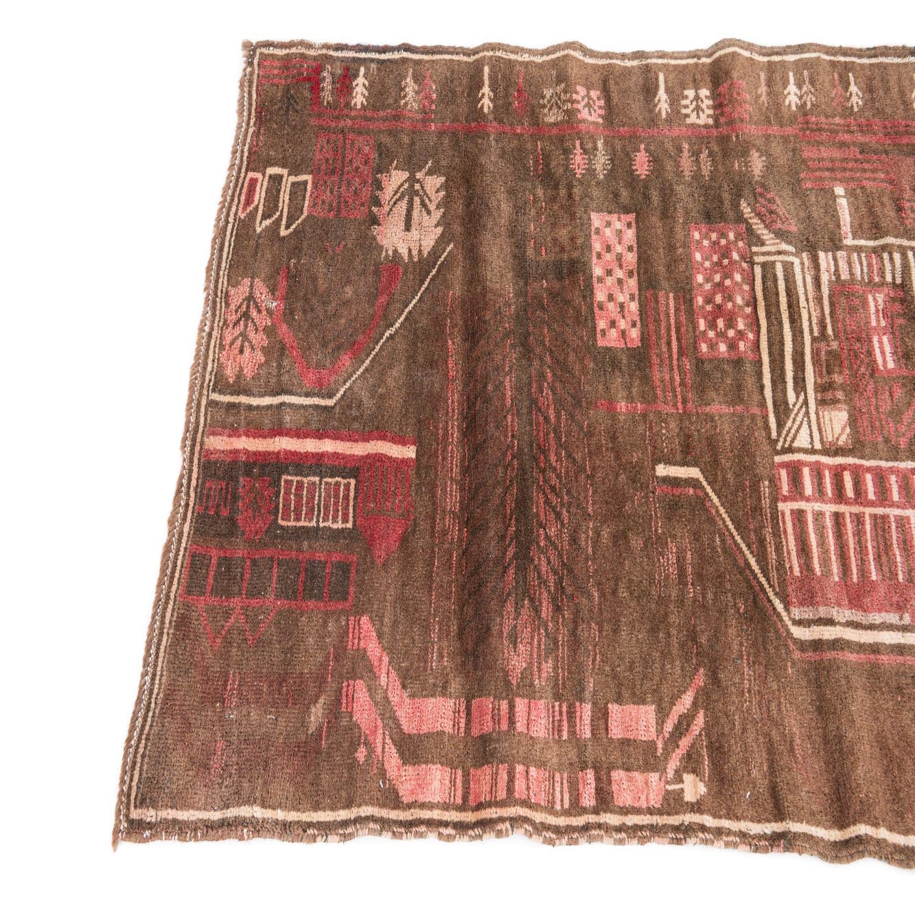 Primary color is Dark Brown. Colors in this rug include: Dark Brown, Brown, Ivory, Rust Red.