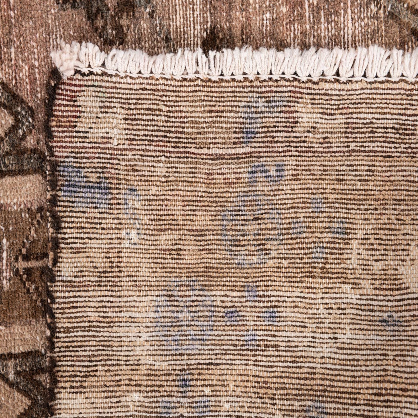 A central geometric medallion and stepped border sit against a dark brown background, with secondary motifs worked in brown and beige to create a layered, vintage-inspired look. The palette is intentionally muted—deep chocolate anchors the design while warm brown and soft beige highlights trace the medallion and floral accents. Hand-knotted, 100% wool construction gives the rug a dense, tactile pile with a low sheen and gentle surface variation that accentuates the distressed aesthetic and the fine linear details.