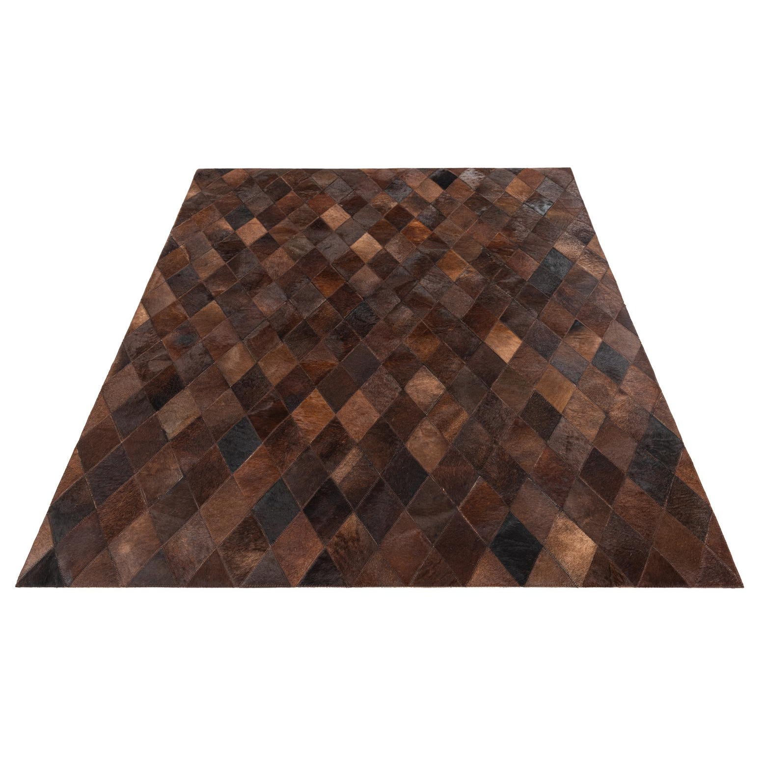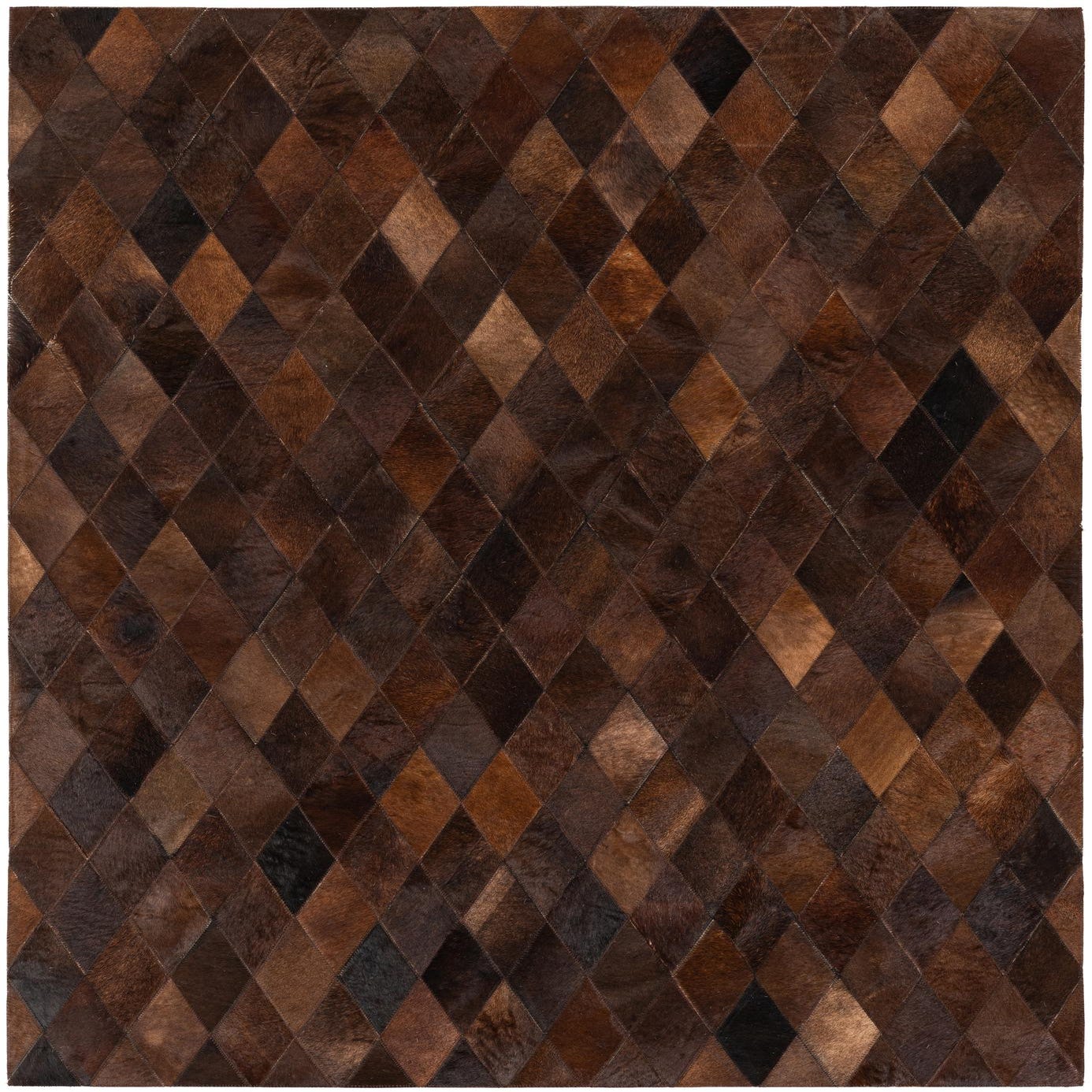 This handcrafted cowhide & leather rug presents a tightly stitched diamond patchwork in rich dark brown and brown tones set against a dark brown ground. Each diamond shows slight variations in shade and nap, creating a subtle, natural sheen and a tactile surface—soft hair-on-hide with the firm structure of leather seams underfoot. The overall effect is a warm, grounded look that works with both rustic and refined interiors.