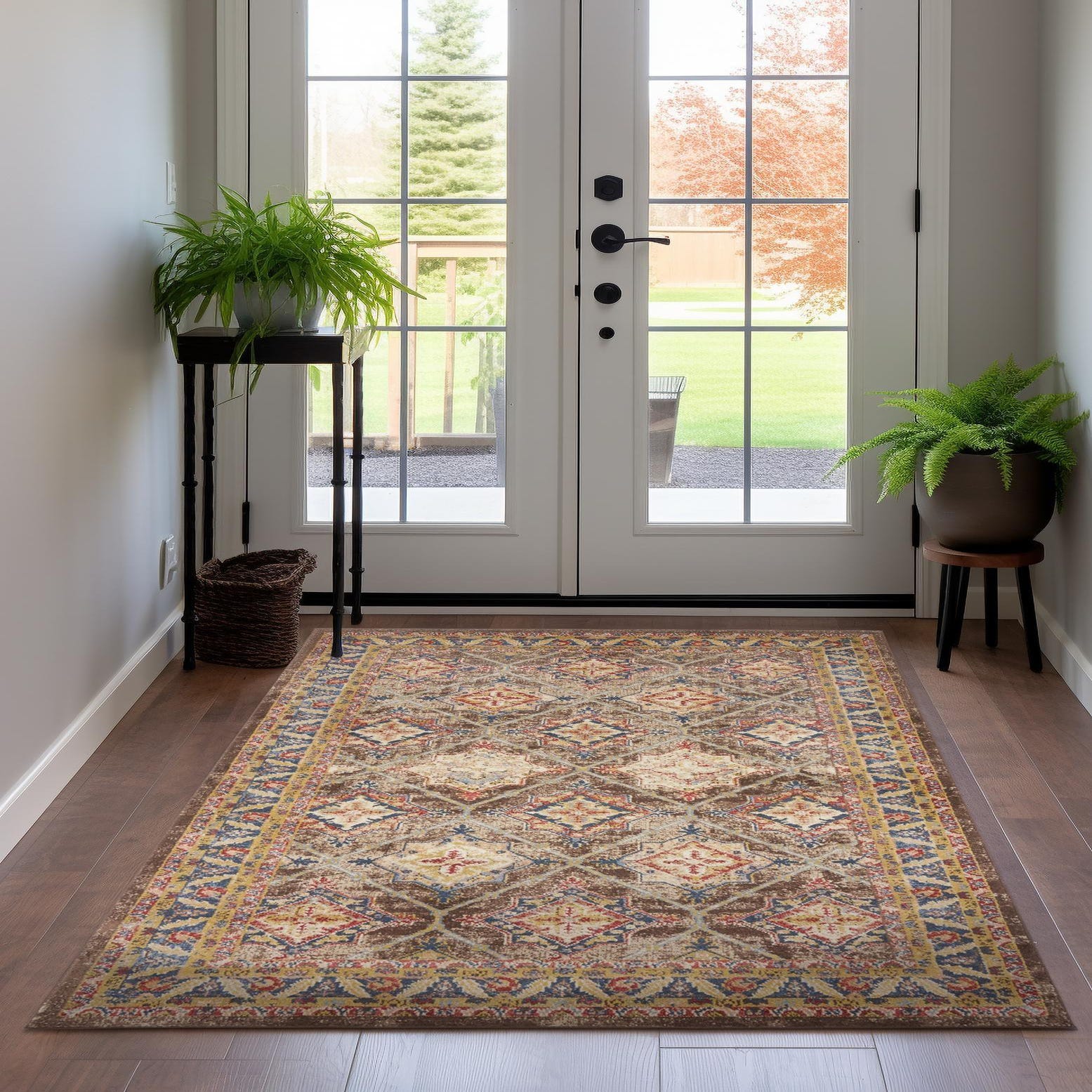 Primary color is Dark Brown. Colors in this rug include: Dark Brown, Brown, Burgundy, Cream, Gold, Light Blue, Terracotta, Navy Blue.