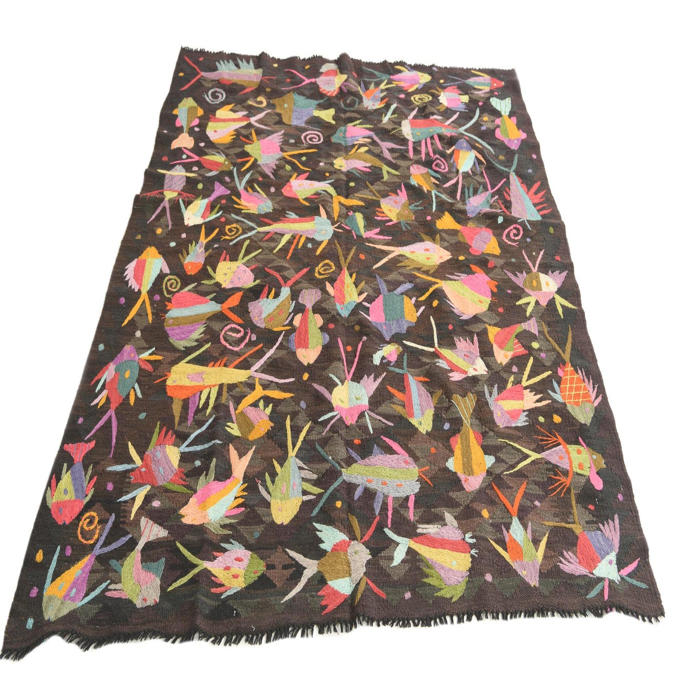 A 4x6 rectangular brown flatweave rug featuring a vibrant, colorful fish pattern in a tribal style, suitable for an indoor living space.