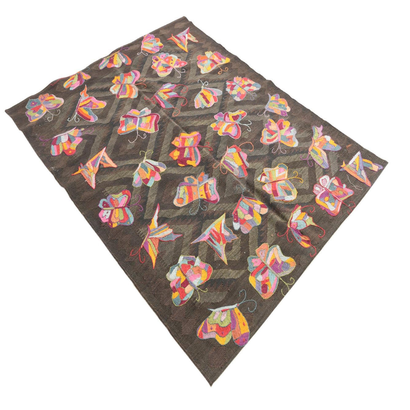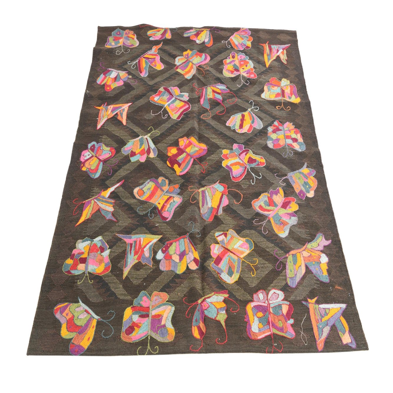 A 4x6 rectangular flatweave rug featuring a dark brown tribal pattern background with colorful embroidered butterflies in various sizes and hues.