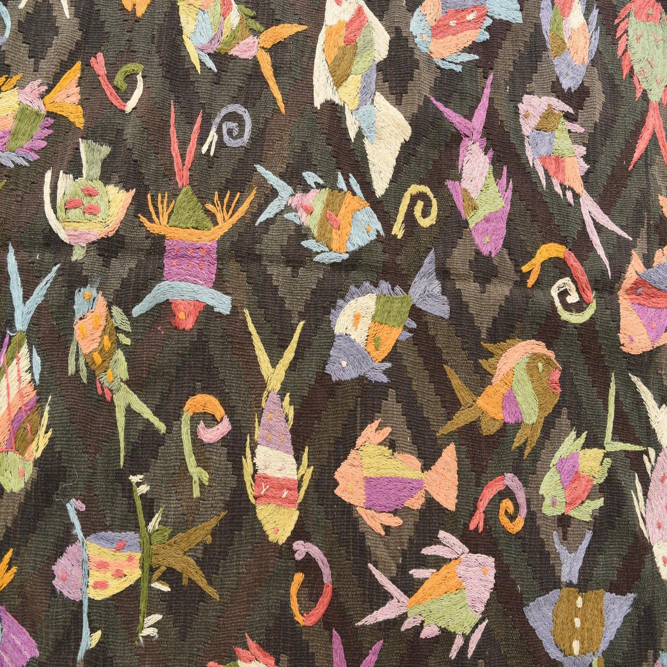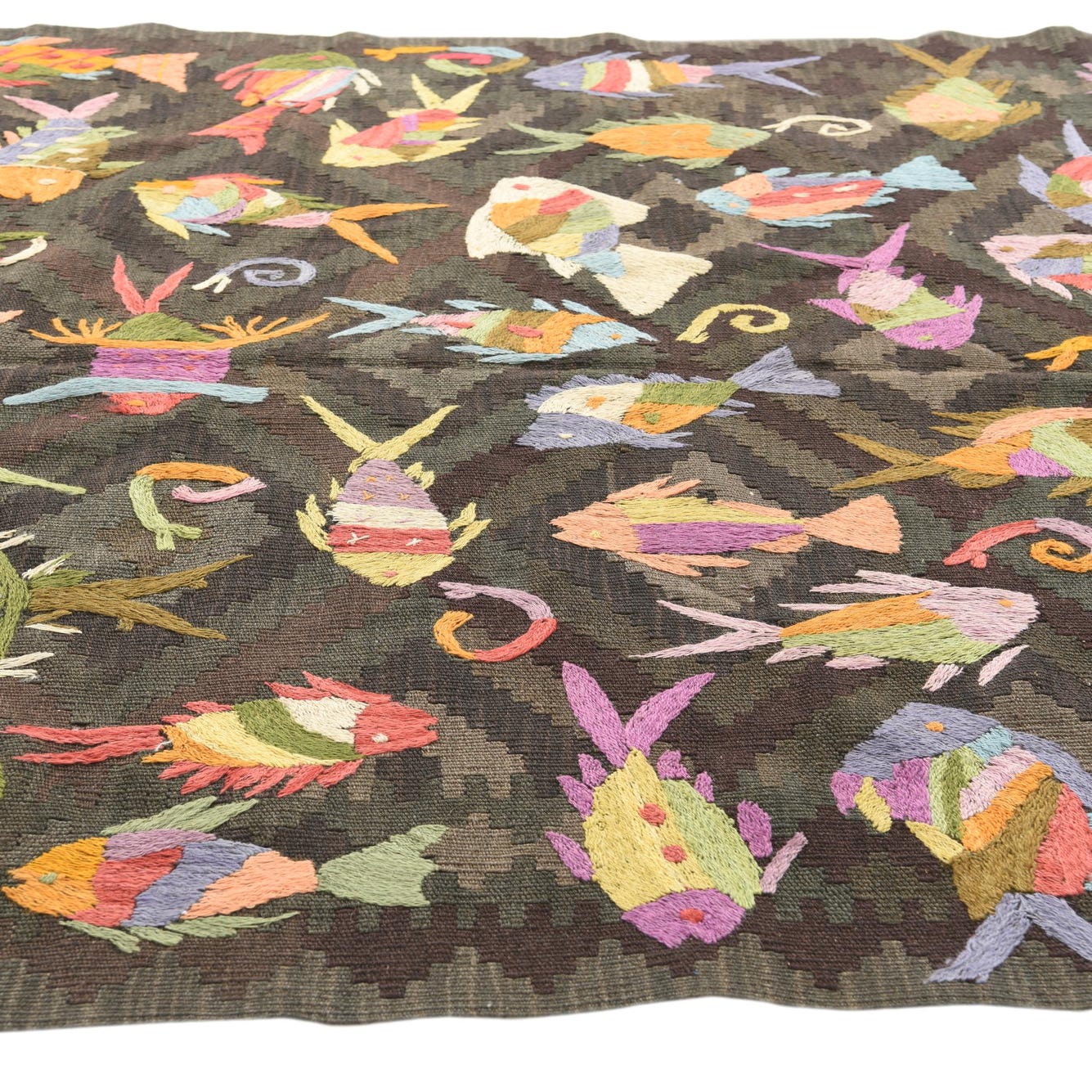 A 4x6 rectangular brown wool rug with a vibrant, multicolored fish pattern, featuring various fish in shades of orange, green, purple, and blue, ideal for a living room.