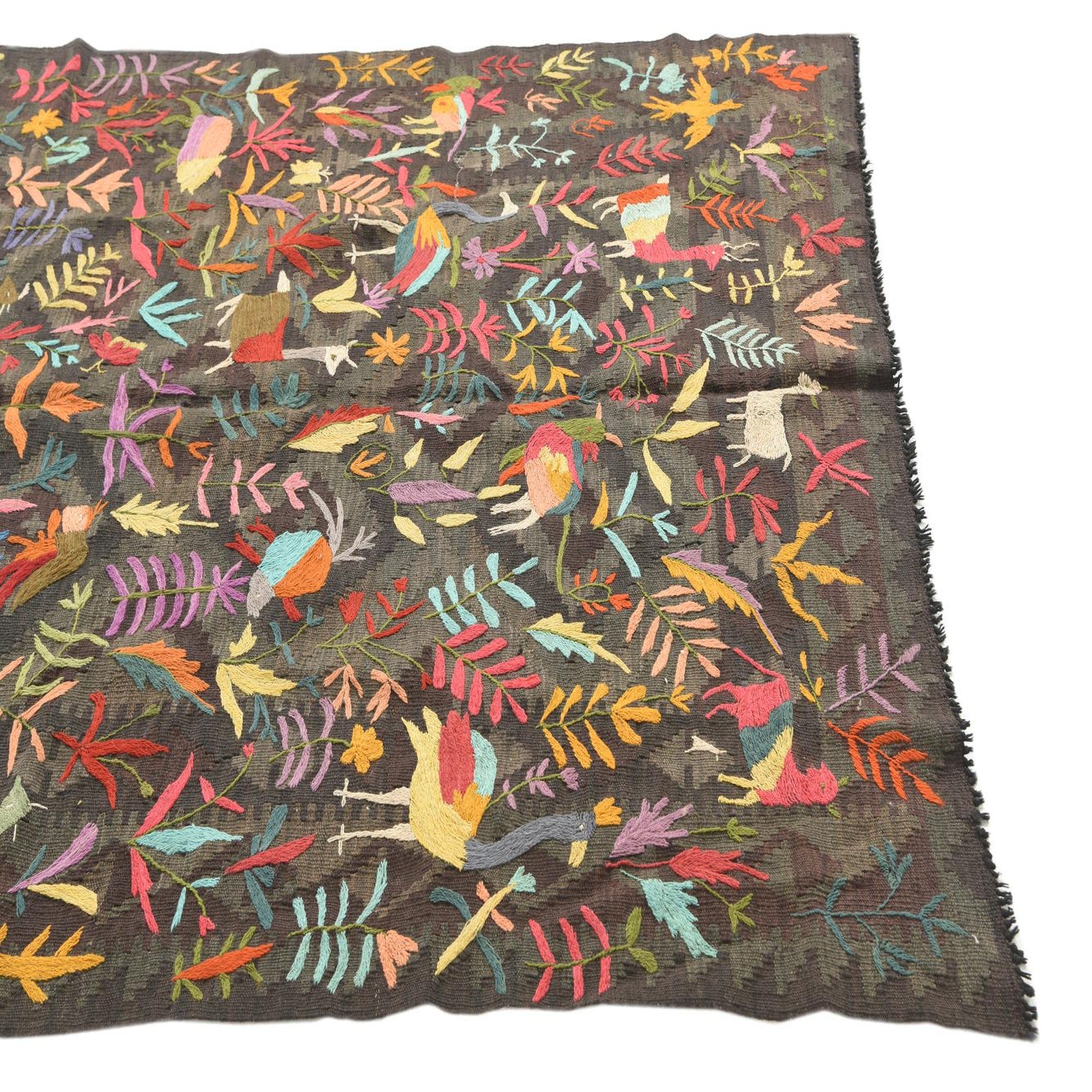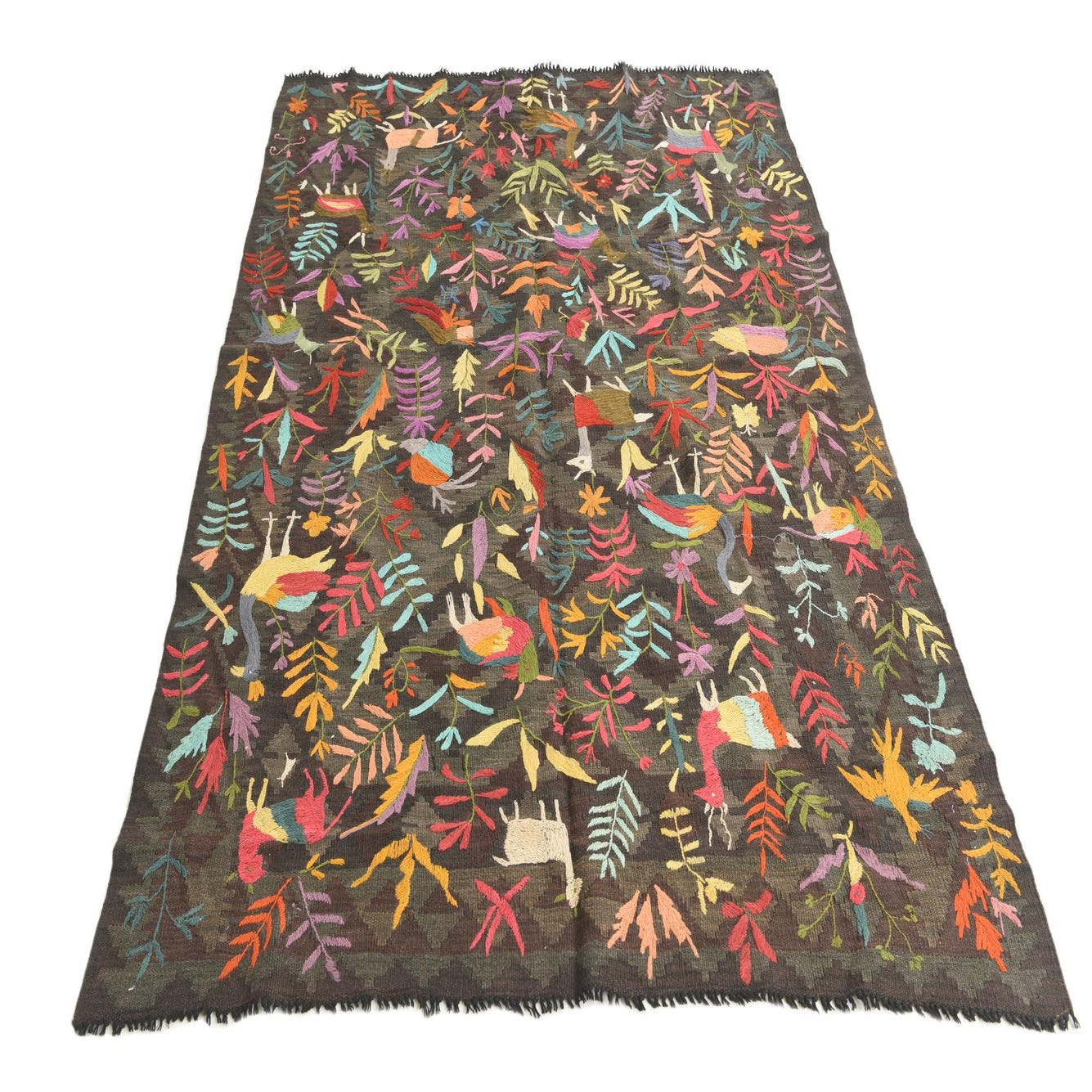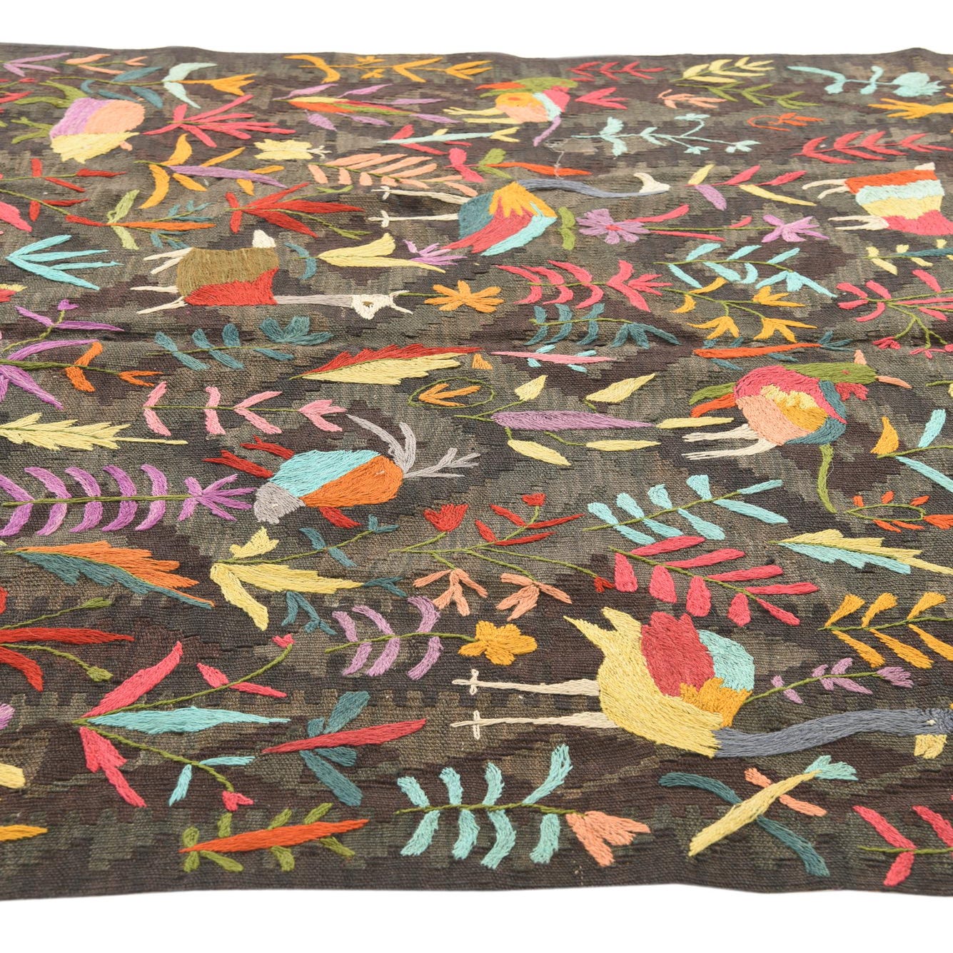 The Kilim Suzani collection offers a 4x6 hand-woven rug crafted from 100% wool, revealing durability and a pleasant texture underfoot. This piece showcases a vibrant and artistic display of botanical motifs and animal figures, dynamically presented against a dark brown background. It features a diverse color palette including gray, green, ivory, red, terracotta, yellow, and violet hues, which contribute to the rug's visual interest and versatility.