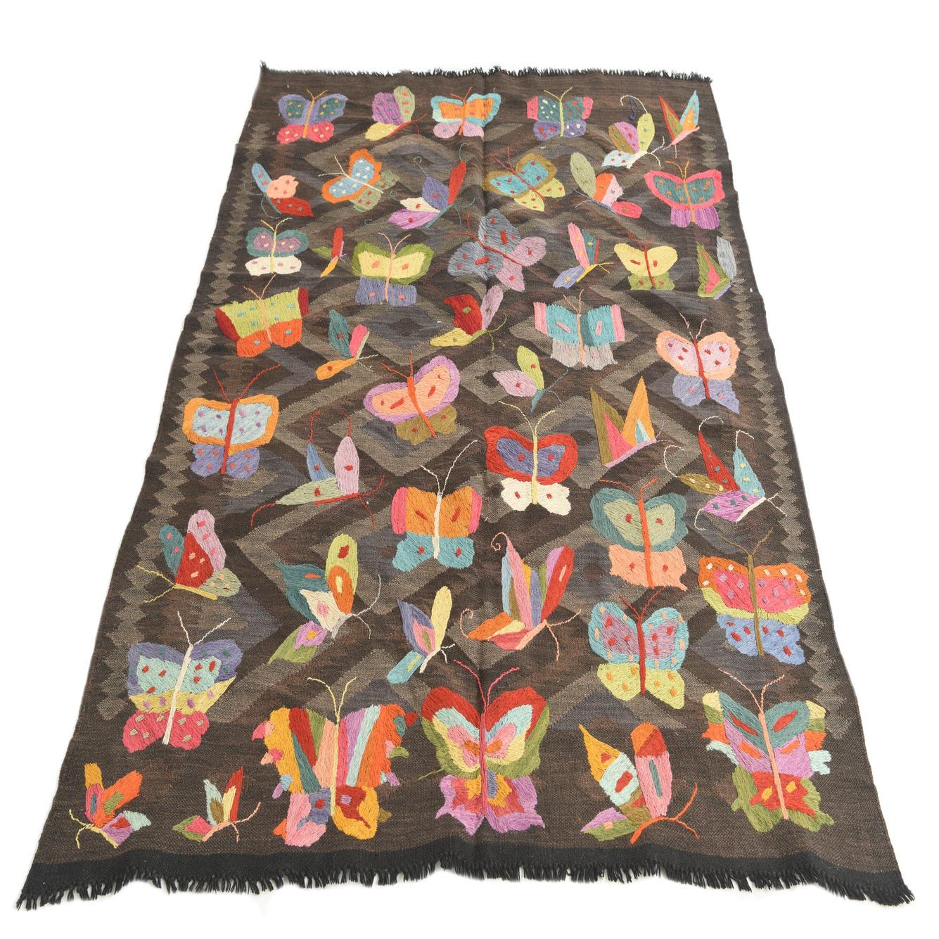 A 4x6 rectangular brown Kilim Suzani rug with a tribal geometric pattern and colorful embroidered butterflies.