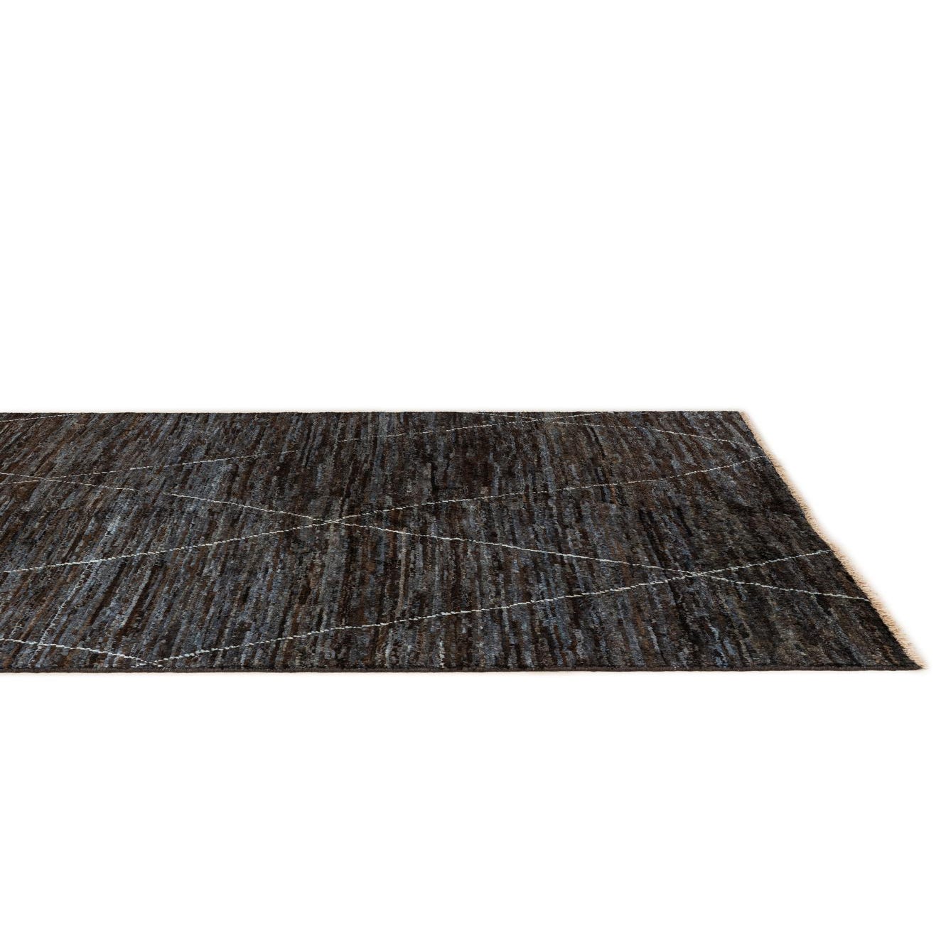 Primary color is Dark Brown. Colors in this rug include: Dark Brown, Blue, Cream.