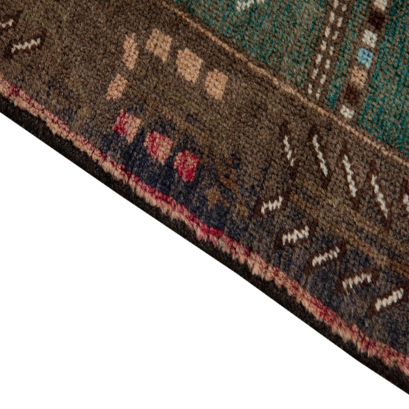 Primary color is Dark Brown. Colors in this rug include: Dark Brown, Brown, Teal, Rust Red, Ivory, Navy Blue.
