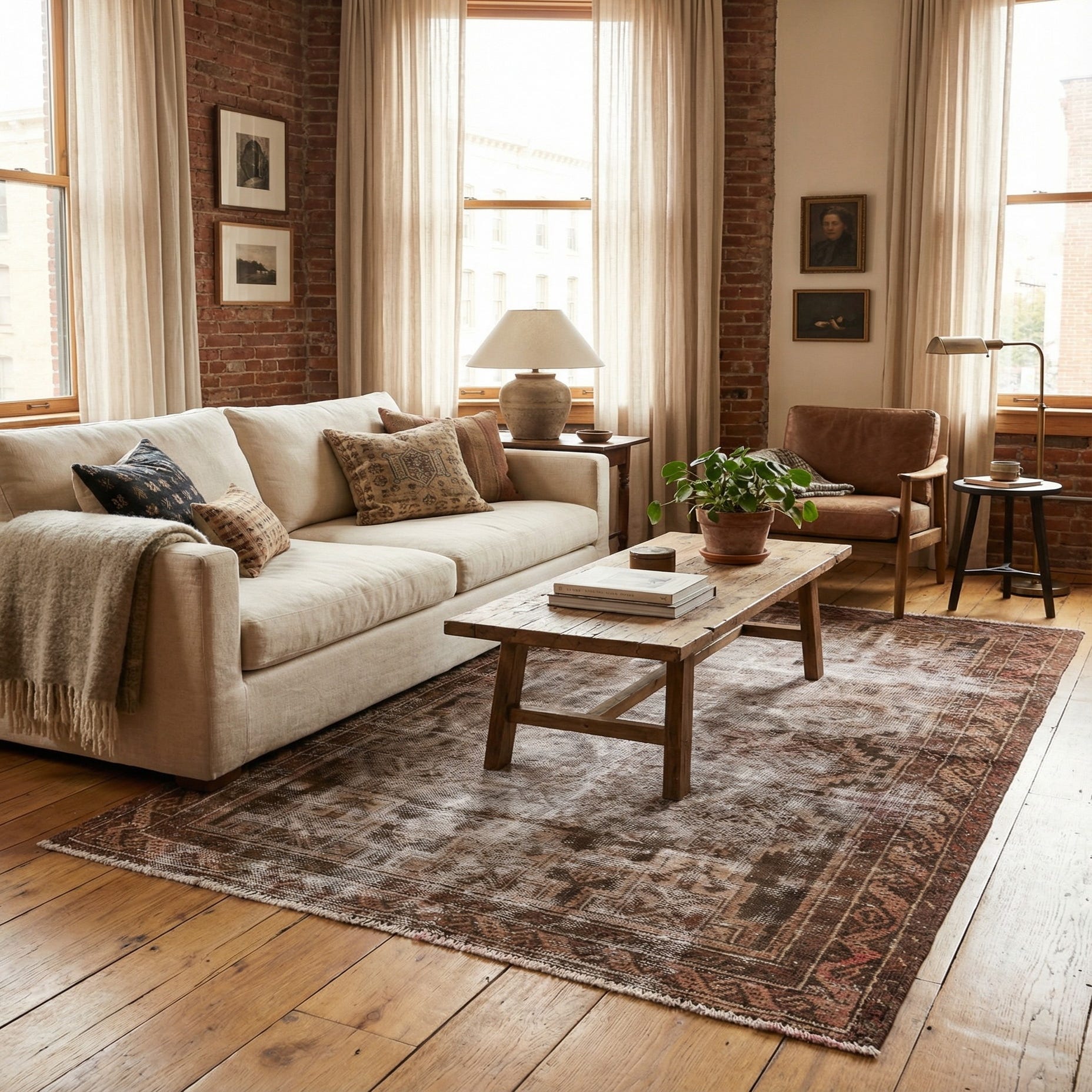 Hand-knotted in 100% wool, the surface has a low, dense pile that feels soft underfoot yet sturdy to the touch, with subtle variations from the handcrafting that add tactile interest. This rug works well anchoring a compact seating area in a living room, beneath a leather sofa and warm wood coffee table, or layered in a bedroom at the foot of the bed. It also pairs nicely with mid-century modern furniture, industrial metal accents, or a traditional interior that benefits from a muted, timeworn layer.