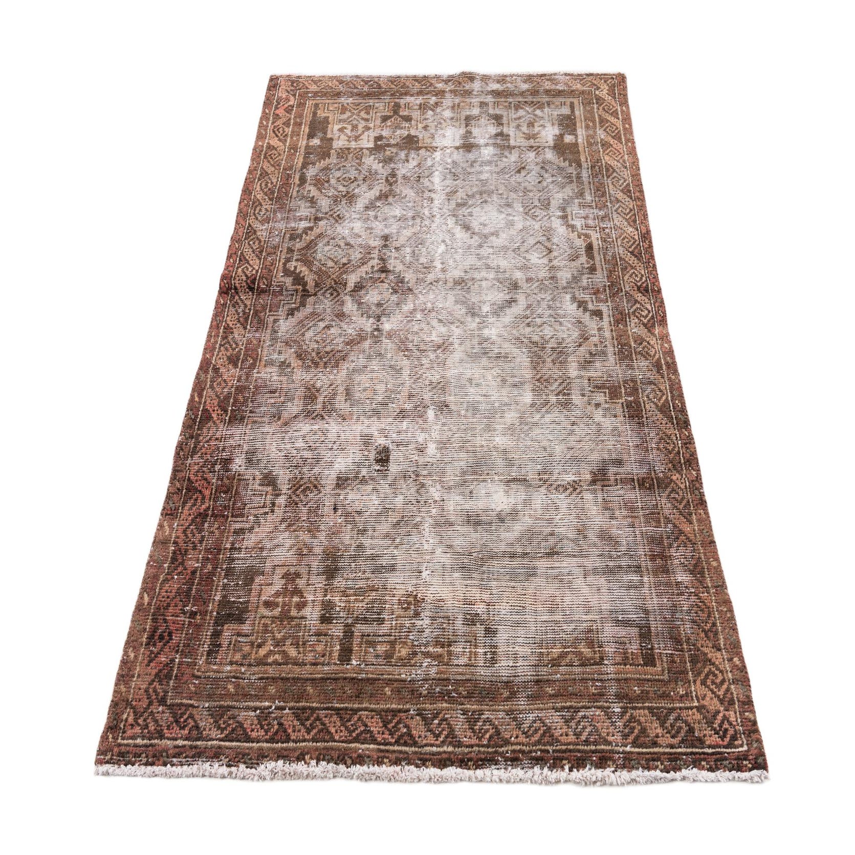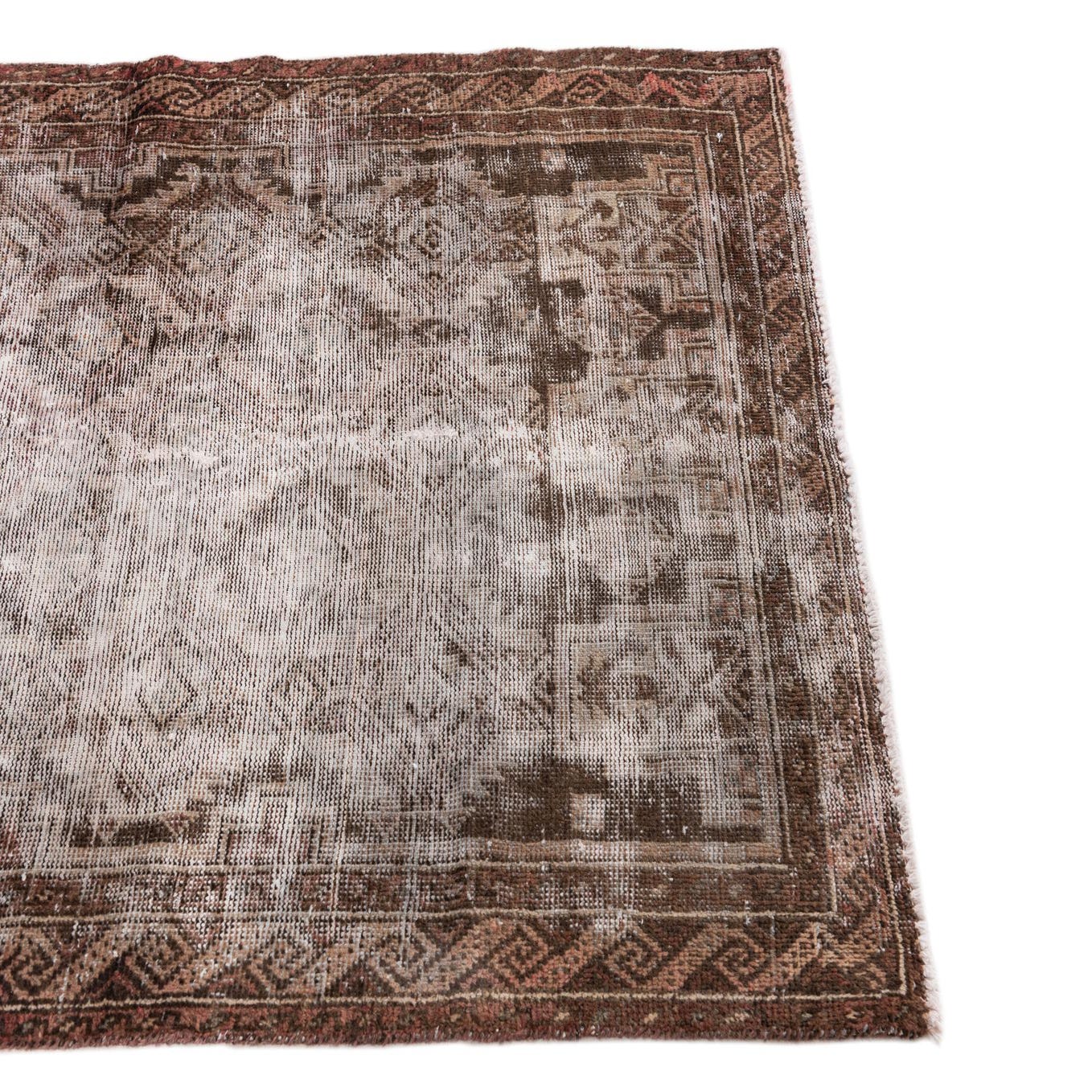 A 4x6 rectangular brown and tan Persian-style wool rug with a distressed vintage look, ideal for a living room.