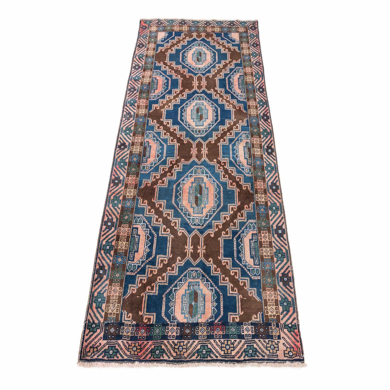 A 4x6 rectangular brown Persian rug with intricate blue, peach, and green geometric patterns, suitable for a living room.