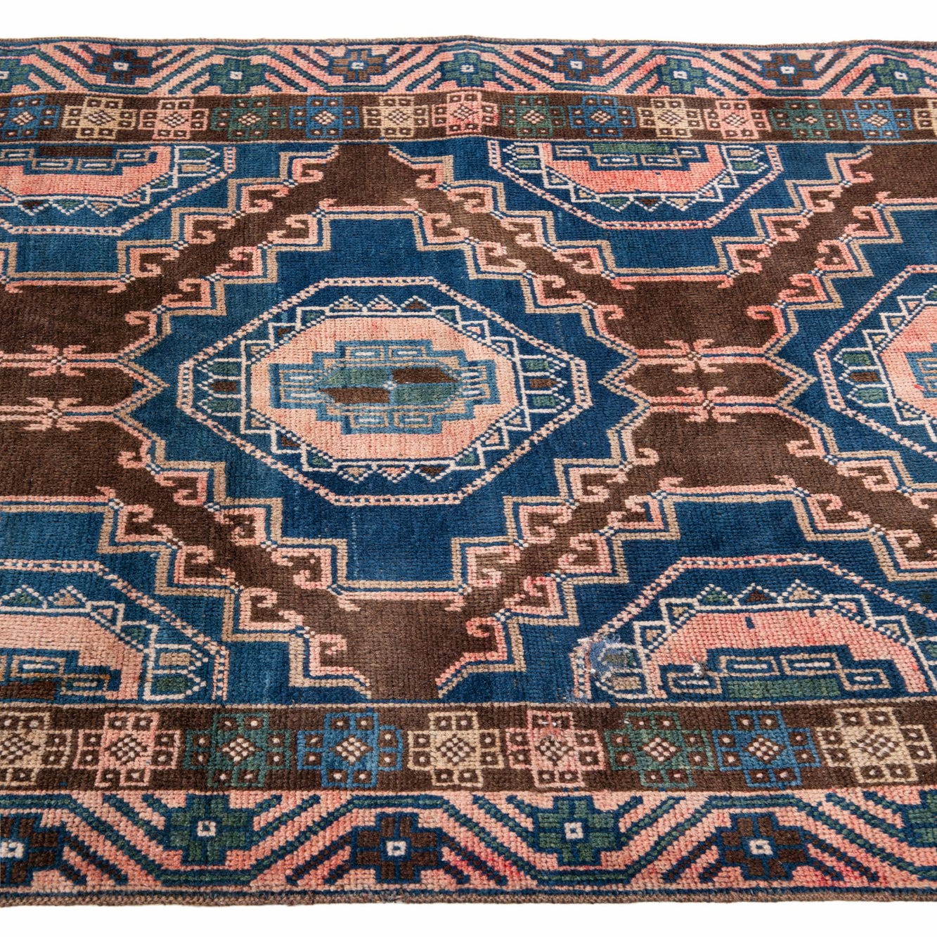Primary color is Dark Brown. Colors in this rug include: Dark Brown, Brown, Rust Red, Navy Blue.
