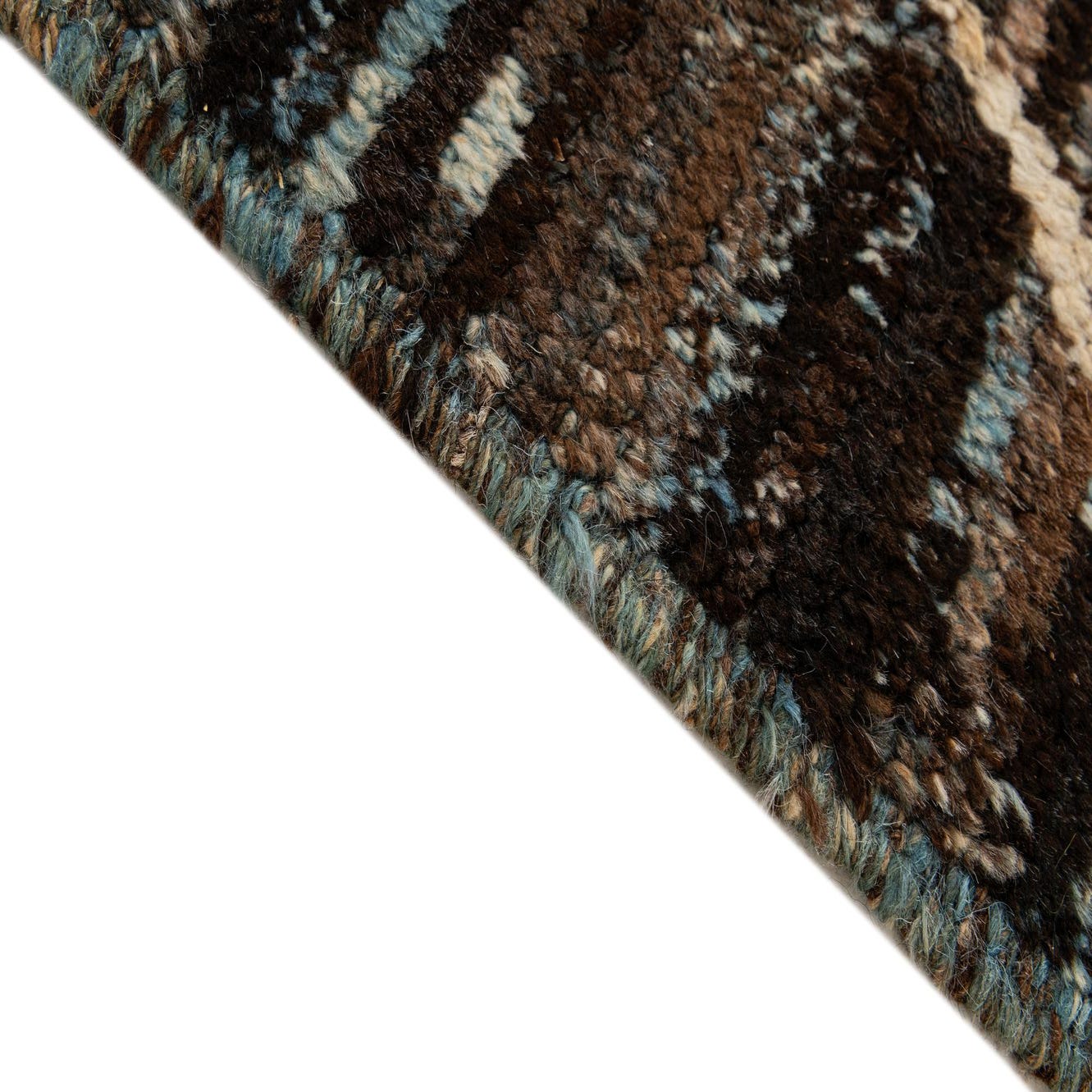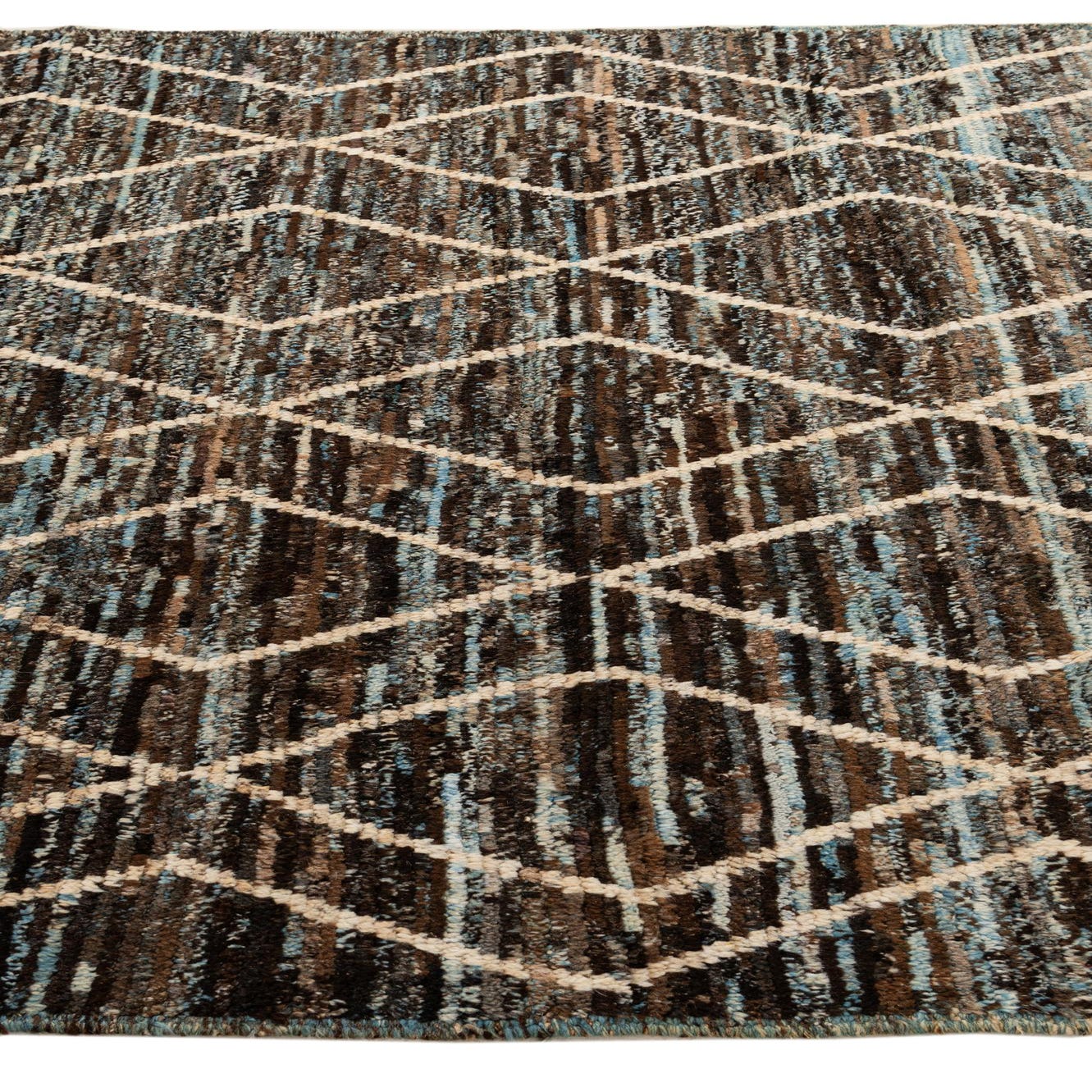 A 5x7 rectangular Moroccan rug featuring a tribal diamond pattern in varying shades of brown, tan, and blue.