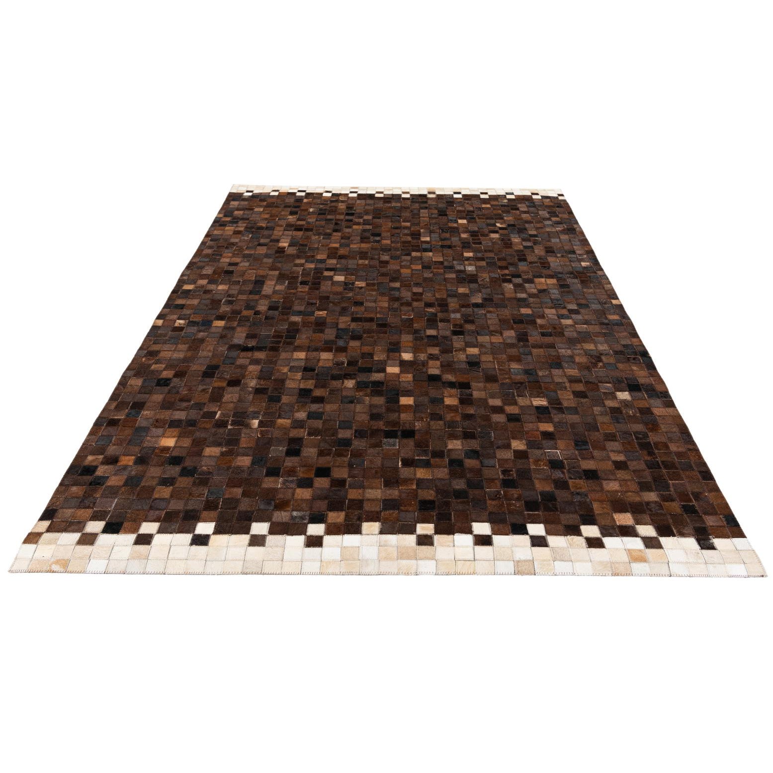 A 5x8 rectangular Cowhide & Leather rug featuring a modern patchwork of varied brown and tan squares, with a contrasting checkered border of white and dark brown squares at the top and bottom.