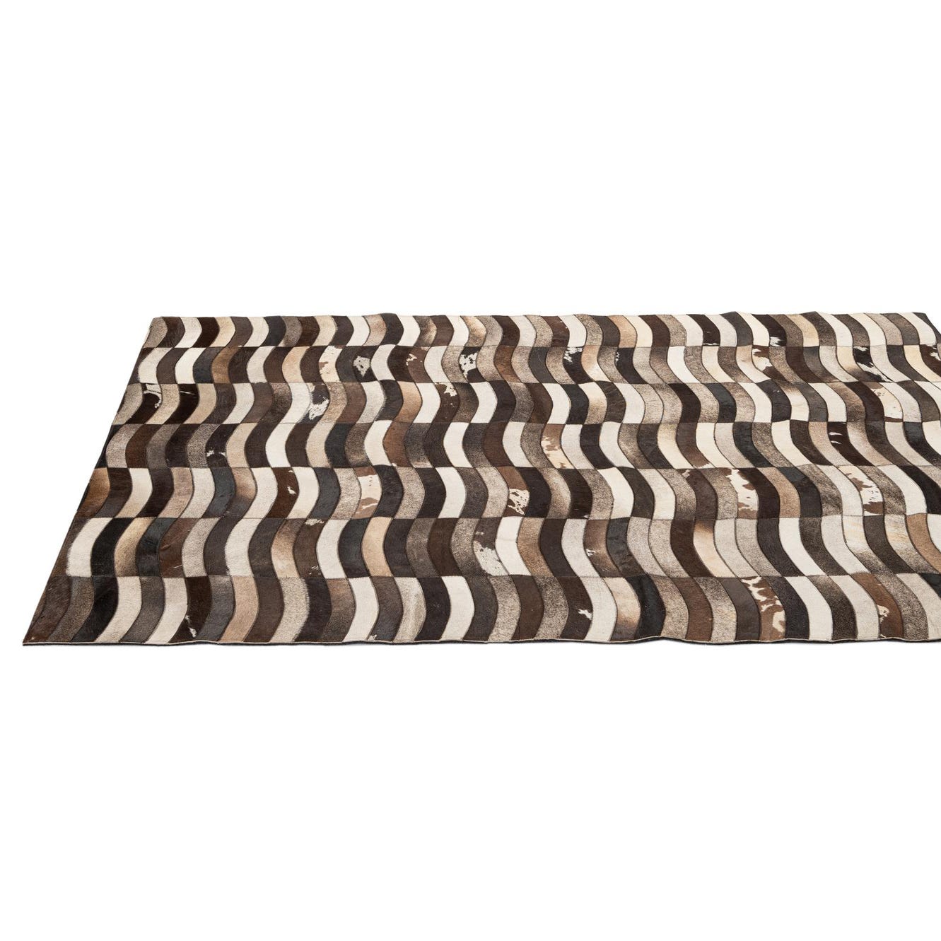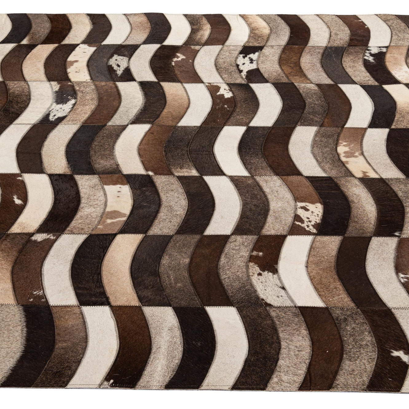 Handmade of cowhide and leather, this rug features a rhythmic wave patchwork pattern formed from curved strips stitched into neat vertical columns. Set against a Dark Brown background, the palette moves through Ivory, Beige, Light Brown and rich Browns, creating layered warmth and subtle contrast. The hair-on-hide surface is soft to the touch with natural nap and variation across patches, while the visible stitching gives a tailored, artisanal finish.